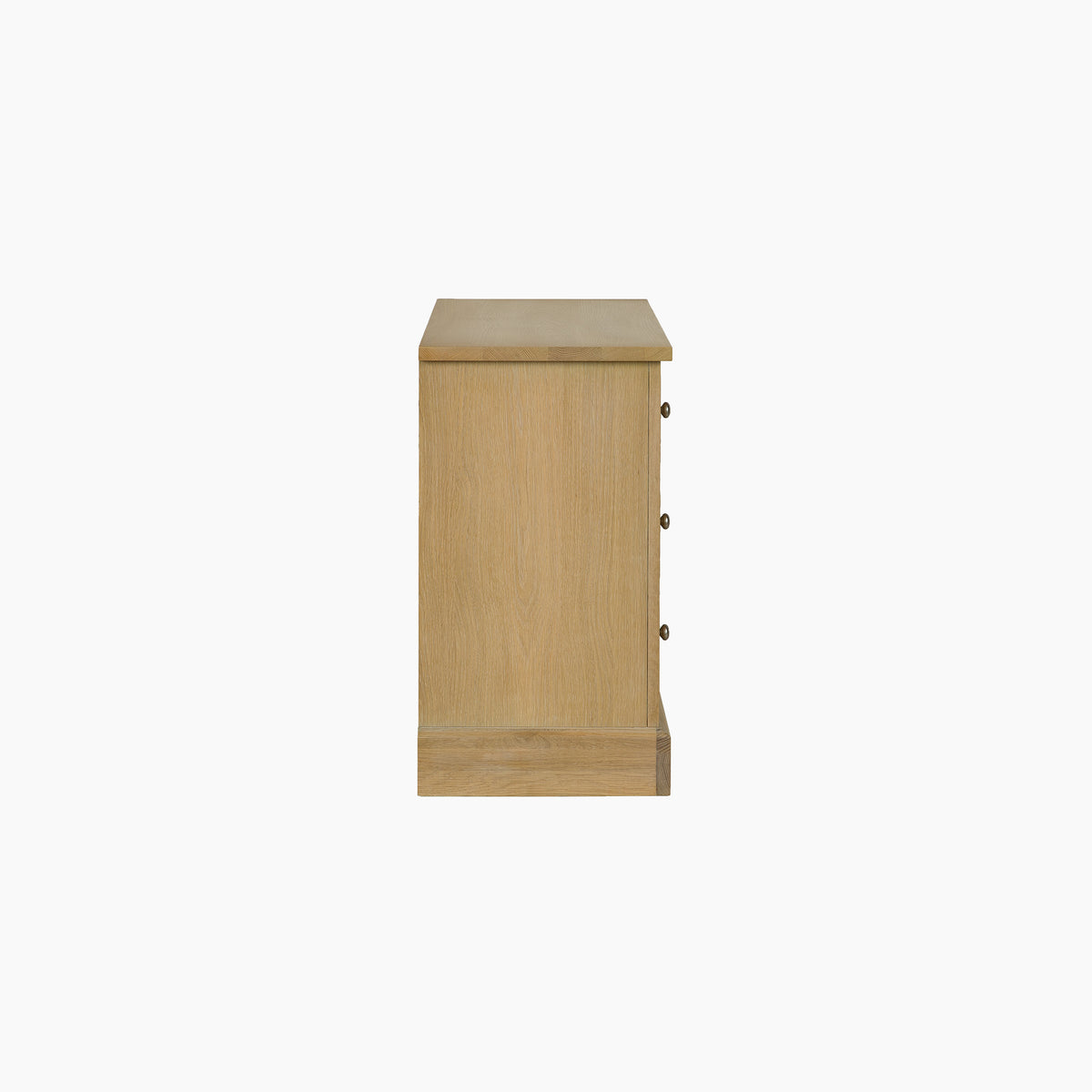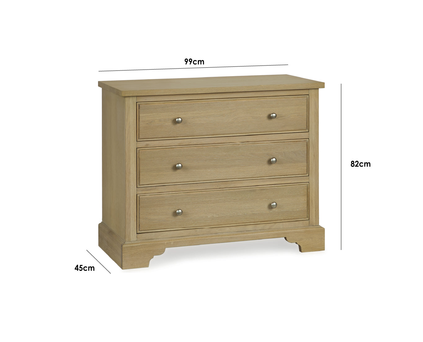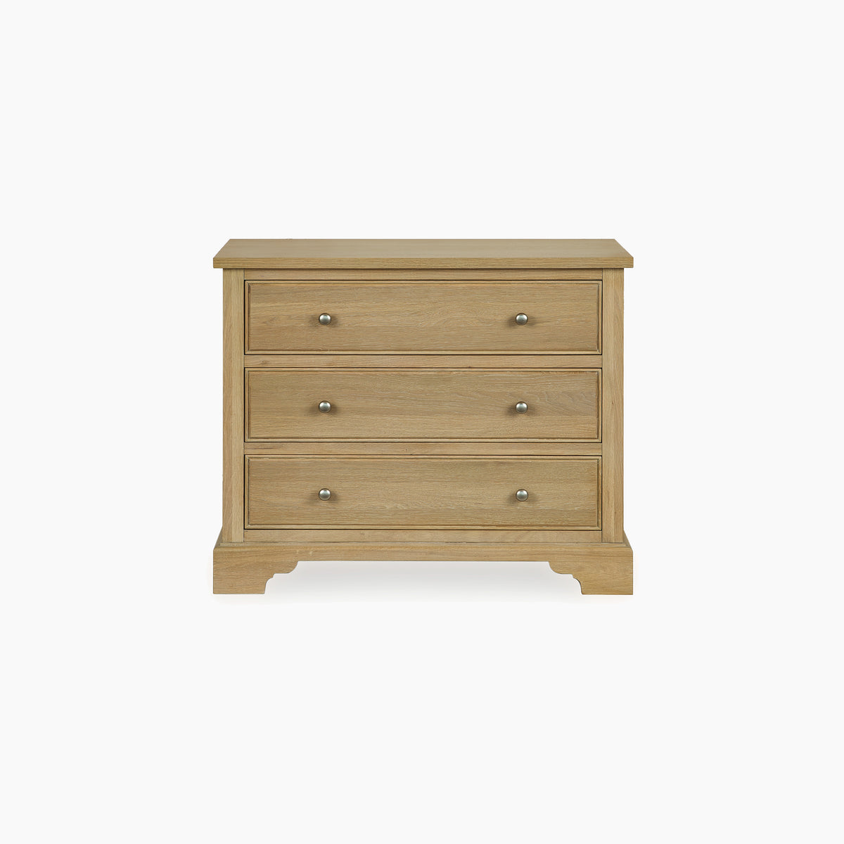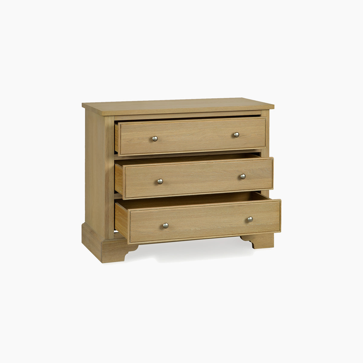 Delicate cornicing and subtle panel detailing add a refined touch, while the three generous drawers offer practical storage for clothing, accessories, or everyday essentials. The solid top is perfect for a bedside lamp, decorative tray, or a collection of your favourite keepsakes.
