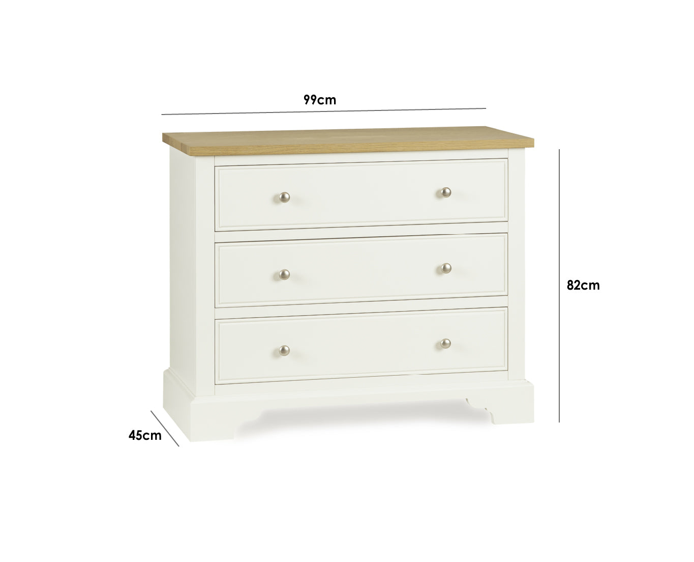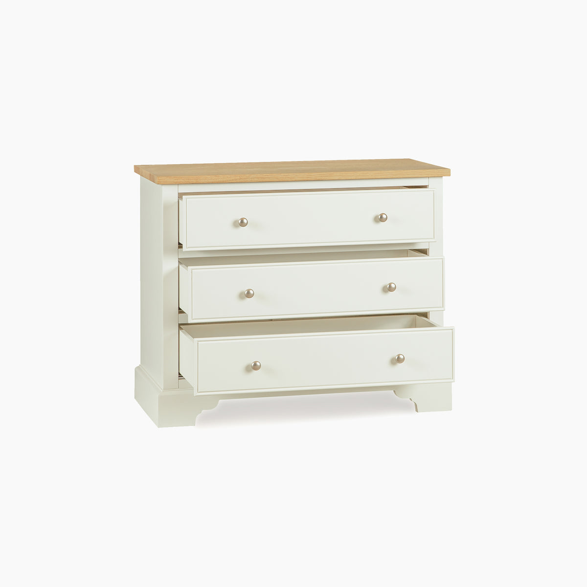 Each of the three drawers is expertly constructed using dovetail joints for strength and longevity, and glides smoothly on telescopic runners. The solid oak top provides a natural contrast to the painted finish, offering a practical surface for a bedside lamp, framed photos, or decorative accents.