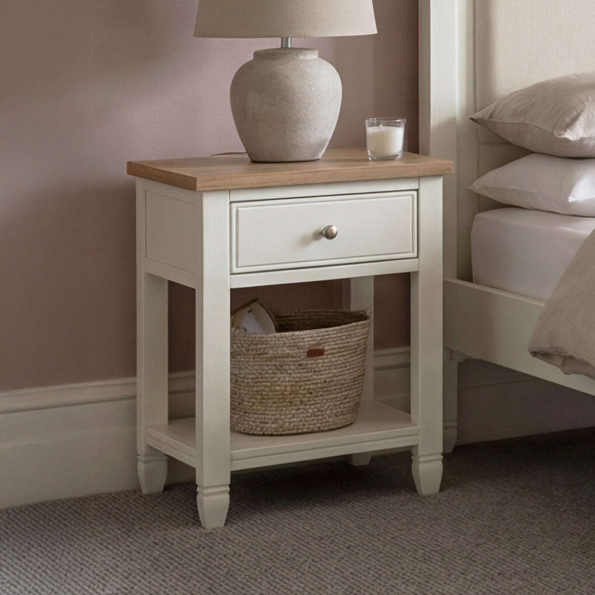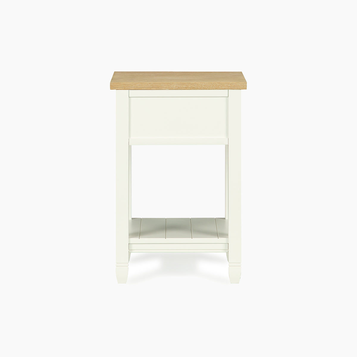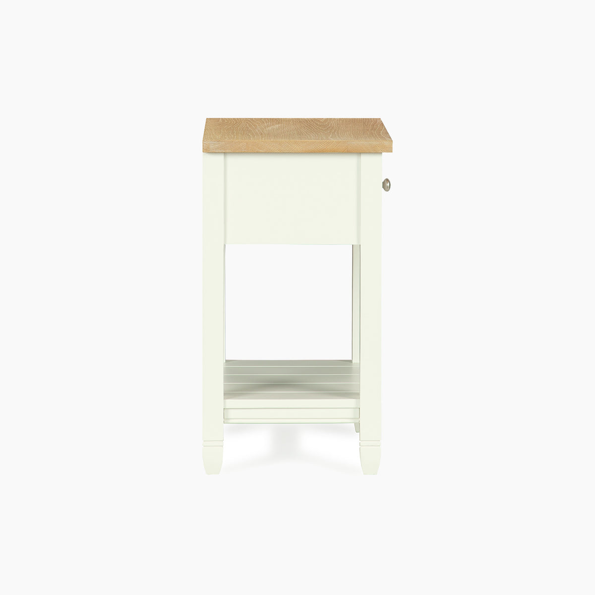 Finished in our signature Warm White with a light oak top, this bedside blends effortlessly into modern country interiors. A single drawer provides discreet storage for nighttime essentials, while the tongue and groove lower shelf is perfect for keeping your current reads close to hand.