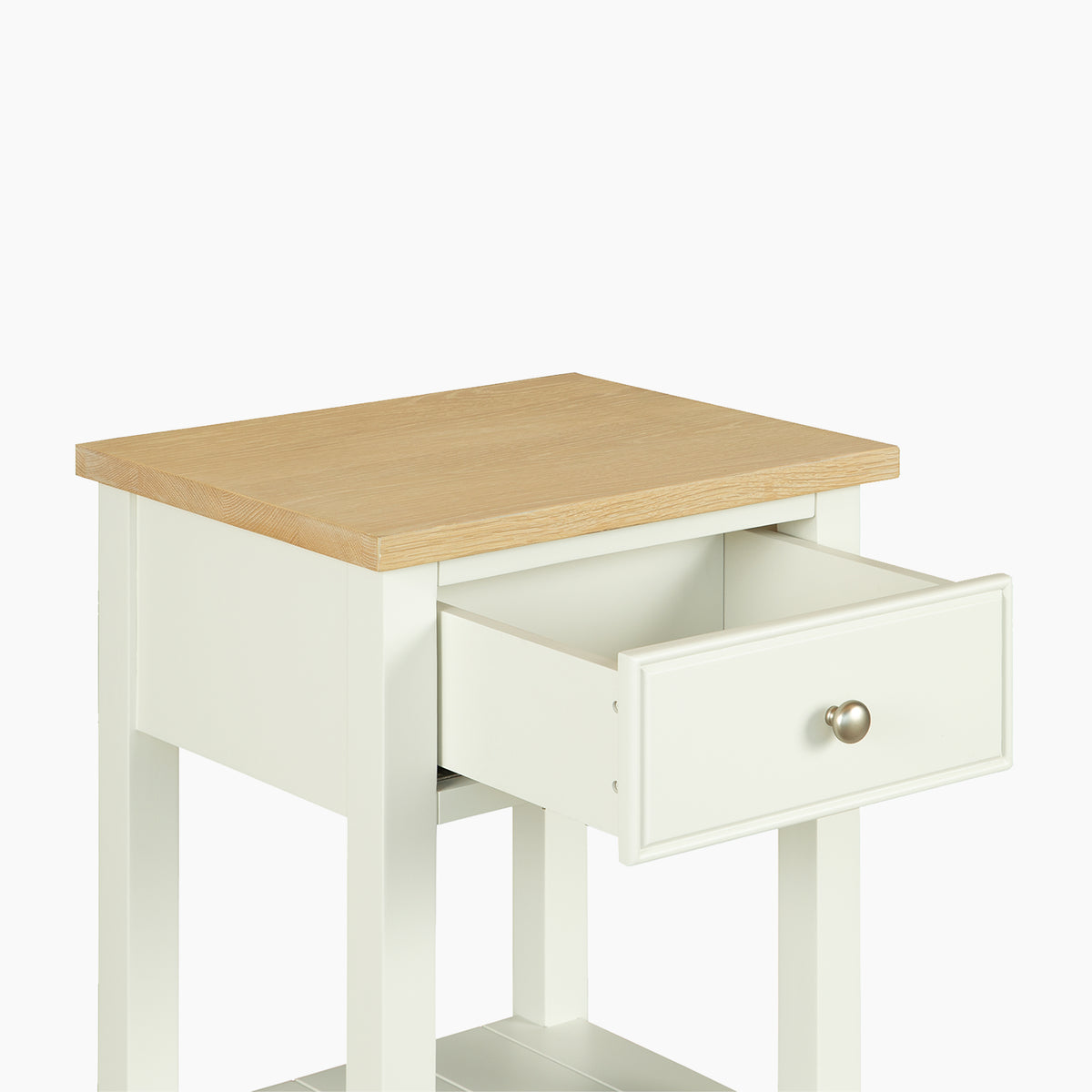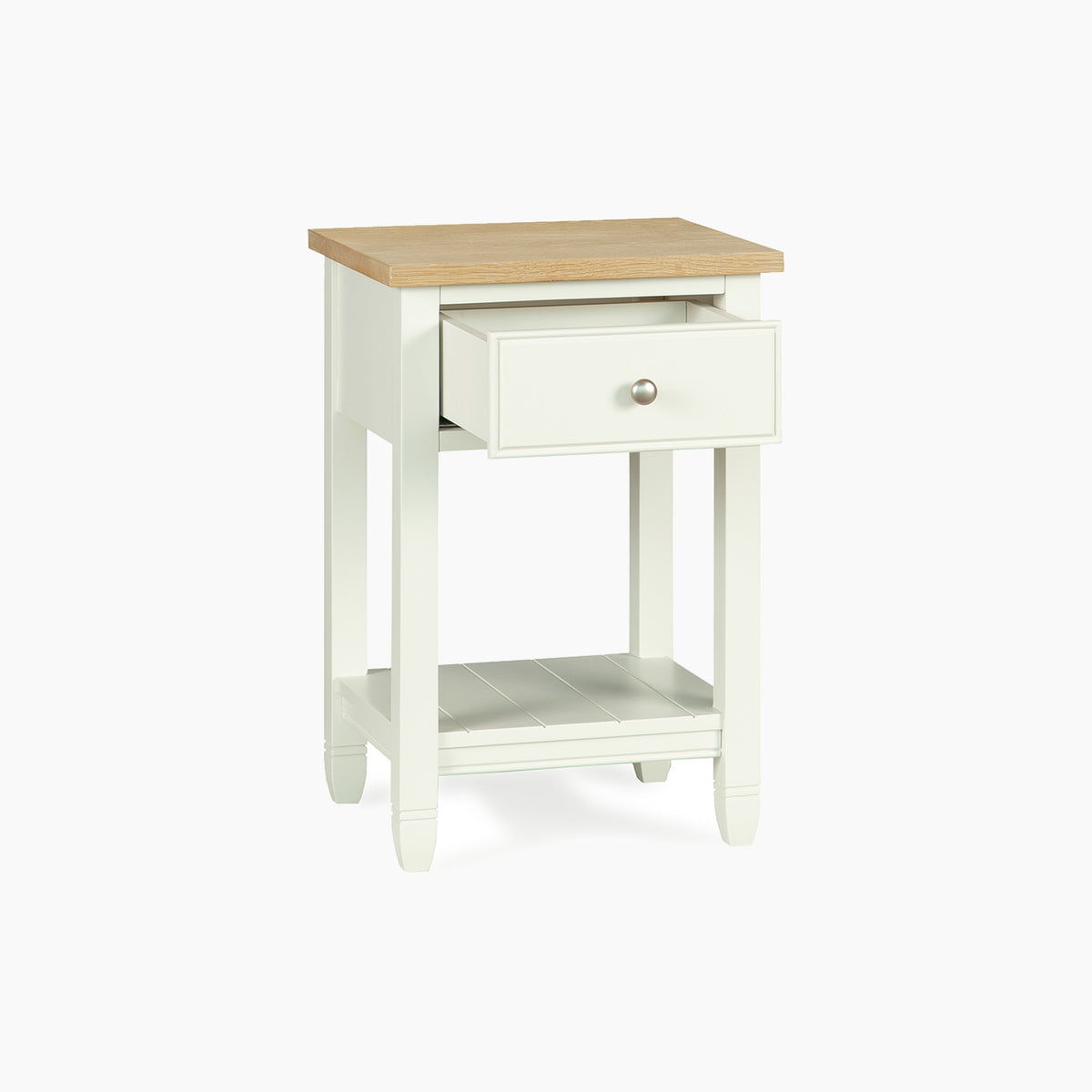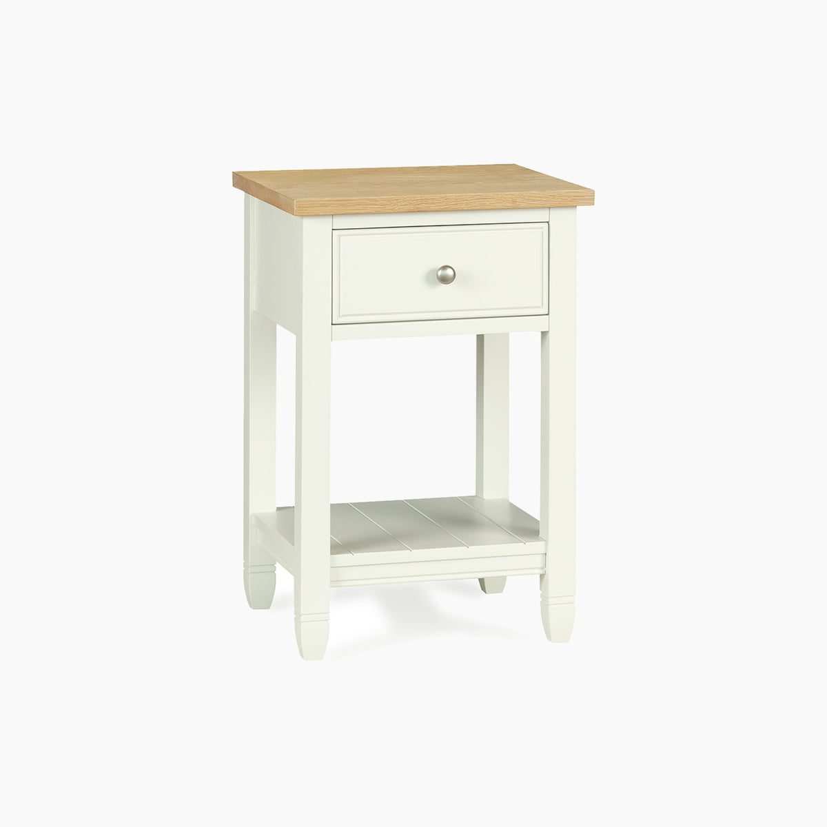 Finished in our signature Warm White with a light oak top, this bedside blends effortlessly into modern country interiors. A single drawer provides discreet storage for nighttime essentials, while the tongue and groove lower shelf is perfect for keeping your current reads close to hand.