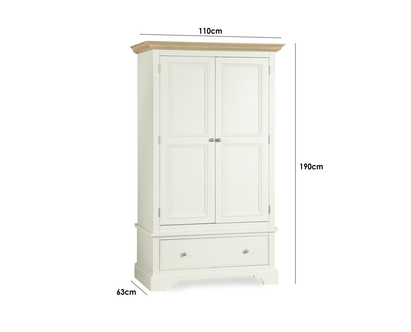 The frame is finished in our signature Warm White, complemented by a smooth solid oak top that adds warmth and natural character. The interior features a single wooden hanging rail with ample space for full-length garments, while three adjustable shelves provide flexible storage for folded clothes or accessories. A spacious bottom drawer built with sturdy dovetail joints keeps everyday essentials within easy reach.