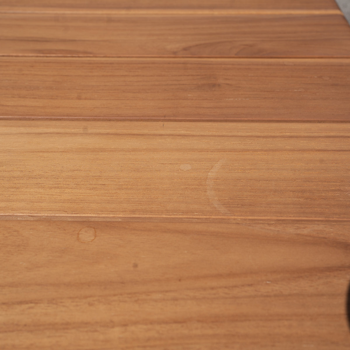 Please note, after time the table top will mellow into a silvery grey colour which will provide a distressed natural finish. All Teak wood can be restored with the use of a pressure washer and teak oil.