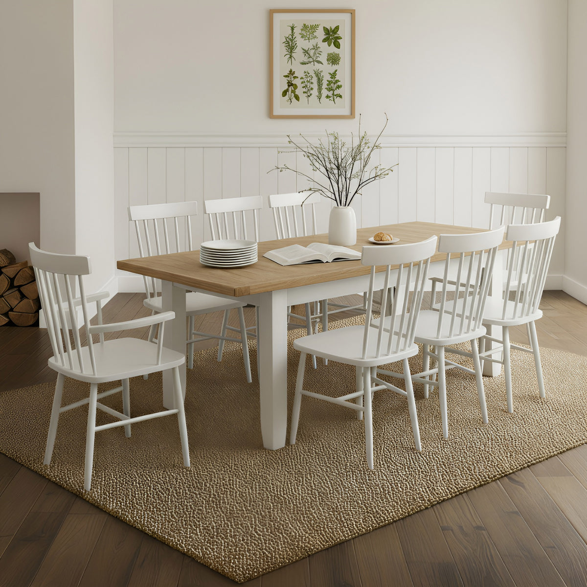 Included in this set are six Burford Spindleback Chairs and two Burford Spindleback Armchairs, each crafted with elegant turned legs, a gently curved spindled back, and a shaped seat for comfort and support. The armchairs add a touch of formality at either end of the table, completing the arrangement with thoughtful balance and symmetry.