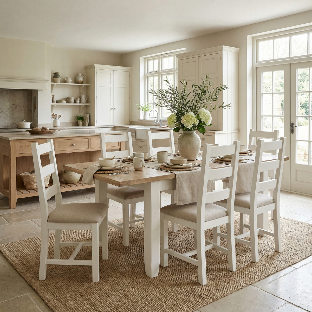Bright, airy kitchen featuring the Burford 4-6 Seater Extending Dining Table in Warm White, wooden cabinets, open shelving, and large windows that flood the space with natural light.