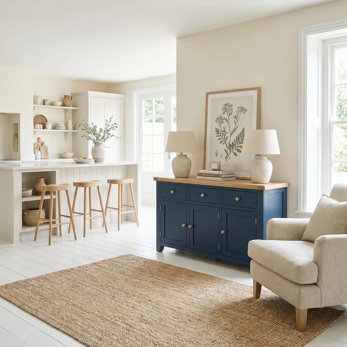 Designed with both aesthetics and functionality in mind, the Burford Sideboard features three spacious doors and three generous drawers, providing ample storage for dining essentials, linens, and more. The thoughtful design ensures a well-organized and stylish living space, ideal for both everyday use and special occasions. This sideboard features a white-washed natural oak top that adds a soft, rustic touch against the sleek, painted cabinets, creating a striking yet balanced contrast.