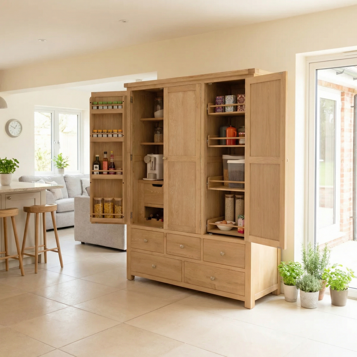 With a focus on both beauty and practicality, this triple-door larder offers a wealth of storage options. Behind the spacious doors, you'll find adjustable shelves and compartments to keep your pantry essentials, kitchenware, and more perfectly organized. The inside of the doors features built-in spice racks, providing easy access to seasonings and smaller items, while five generously sized drawers offer additional space for smaller kitchen essentials. Just as no two trees are alike, all of our specially curated natural oak pieces have unique grain patterns making each piece a truly individual work of art. Each item tells its own story, adding character and charm to any space, making it the perfect finishing touch to your home.