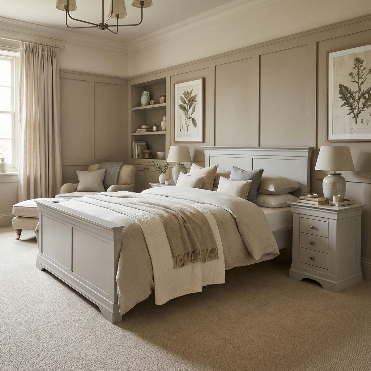 The Chalbury 3 Drawer Bedside Table in Pebble Grey, styled with a lamp, books, and a plant beside a tidy bed, is perfect for bringing modern flair to your room.