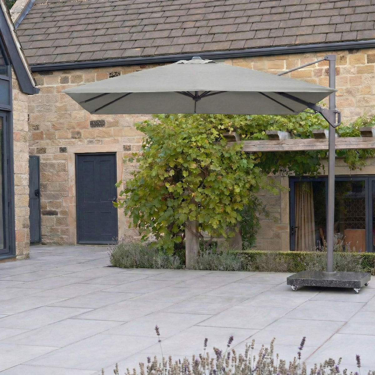 The Pacific Lifestyle Salerno Hammered Grey Granite 90KG Wheeled Parasol Base sits on a stone patio, surrounded by vibrant garden greenery and flowers.