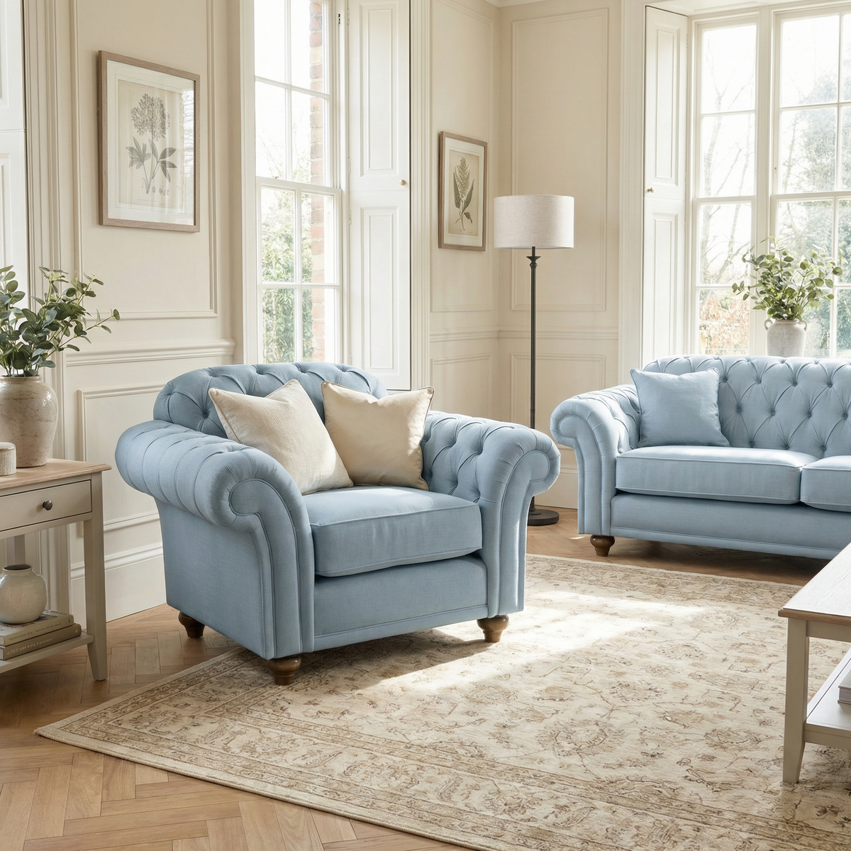 The Chesterfield Loveseat in Sky Blue sits in a bright bay window, accented by cushions, plants, and grey curtains.