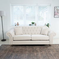 The Chesterfield 3 Seat Sofa in Ivory, boasting a traditional British tufted design, sits with cushions in a bright room featuring a lamp and window blinds.
