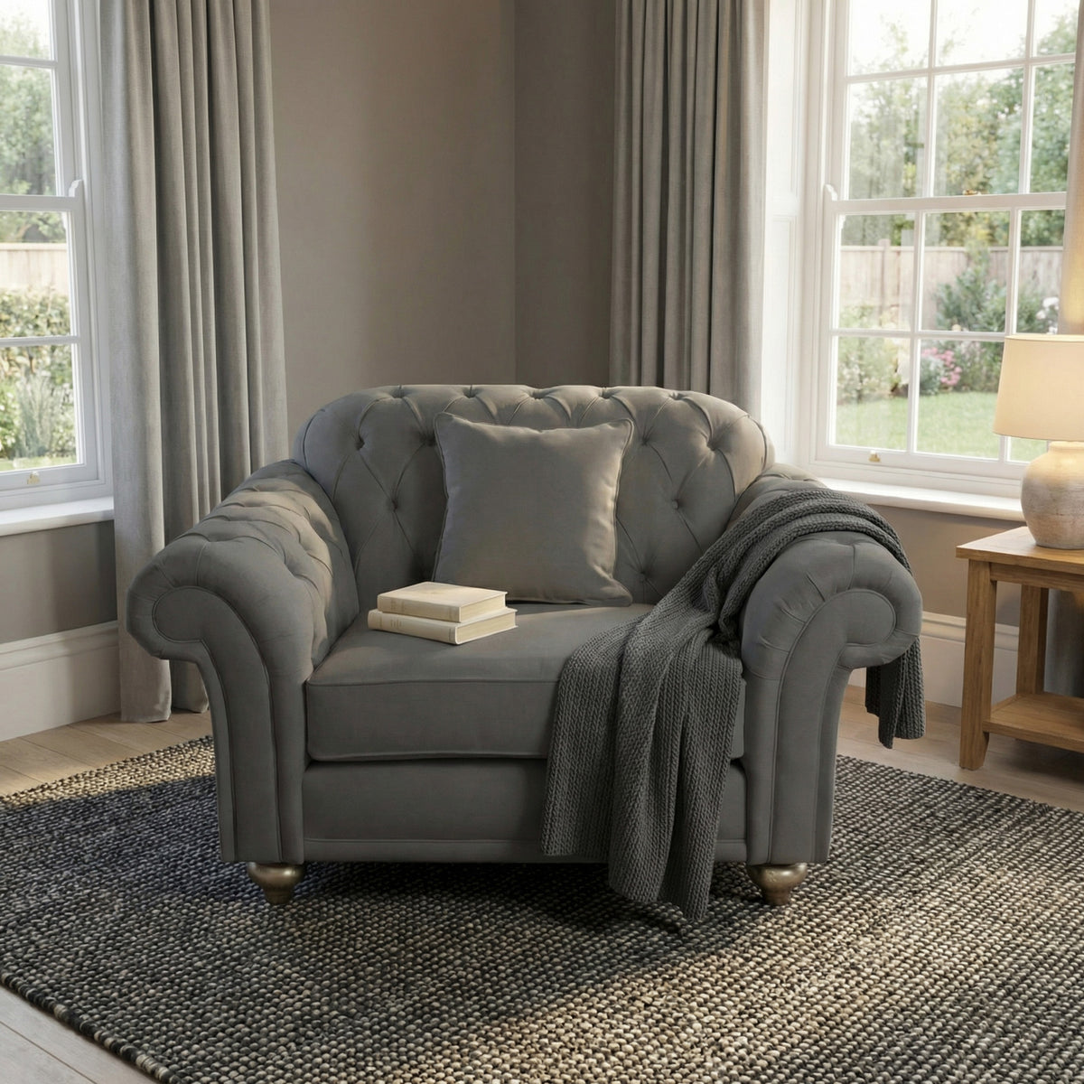 Introducing the Chesterfield Loveseat in Smoke Grey blend brings a sophisticated edge to traditional Chesterfield design. The cool, neutral smoke grey colour pairs effortlessly with various design styles, offering a perfect balance of contemporary and classic aesthetics. The deep-button tufting, gently rolled arms, and durable linen-polyester fabric ensure both comfort and longevity, making this piece an ideal addition to any living room, lounge, or study.