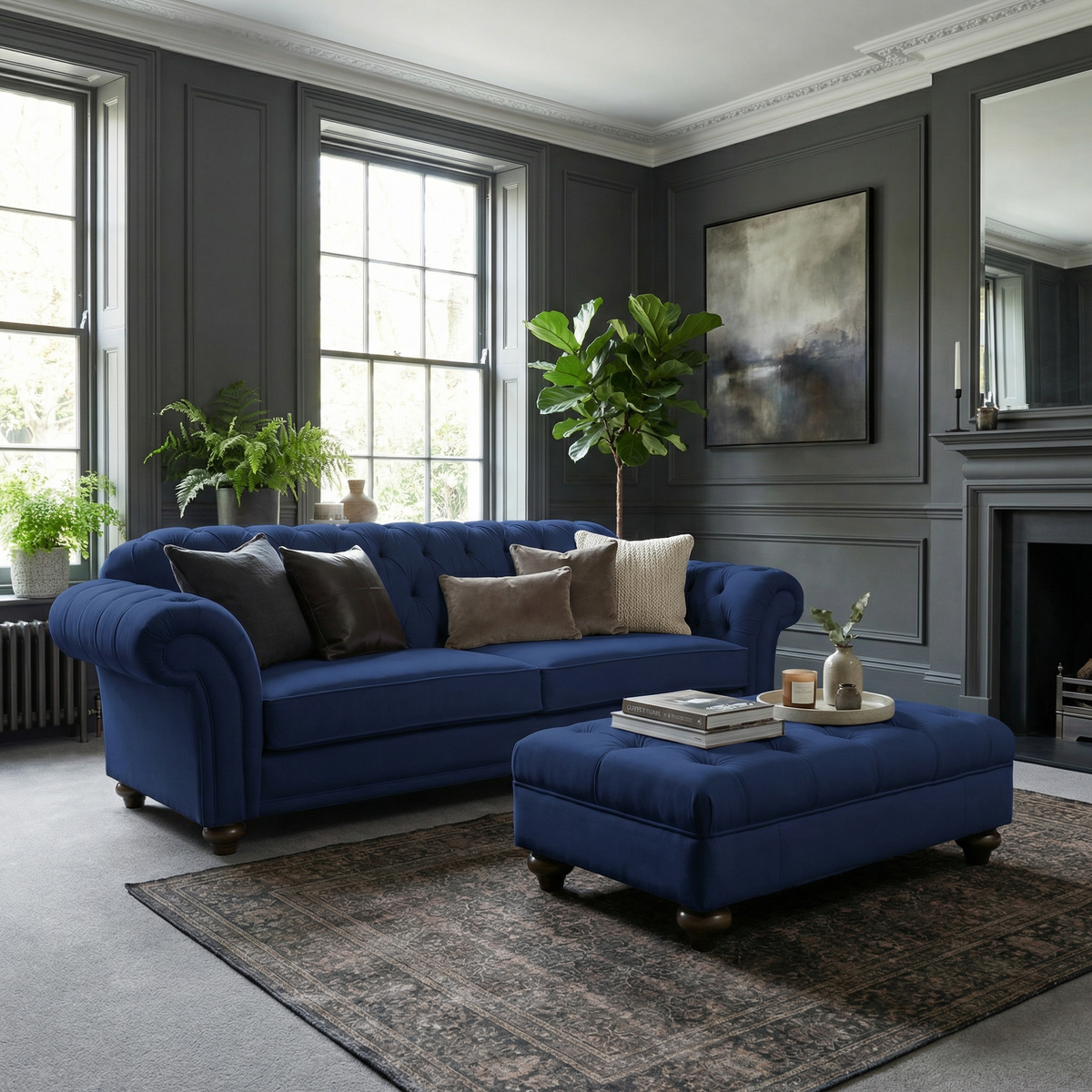 The Chesterfield Velvet Footstool in Royal Blue- a refined blend of form and function that adds a sophisticated touch to your home. The rich, vibrant royal blue velvet adds an opulent touch, its deep hue creating a striking contrast against both traditional and contemporary interiors.