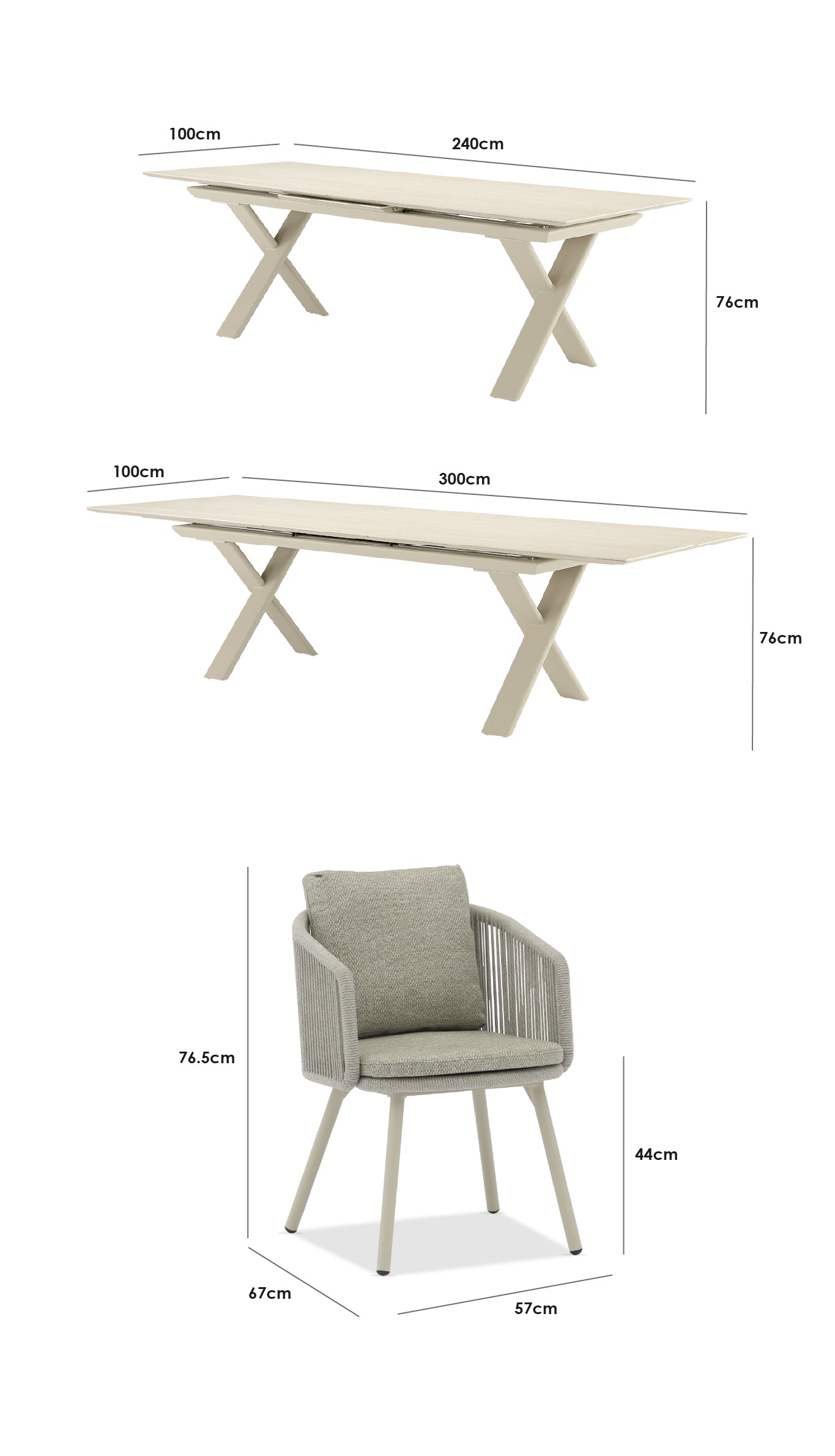 Included in this set are eight Dekota Dining Chairs- a particular favourite for their comfortable ergonomic shape, highlighted by its aluminium frame. Light yet strong, the aluminium frame is wrapped with a hydrophobic polyester rope weave, offering a look that’s both stylish and inviting. This carefully crafted design brings a soft texture and a modern edge, while the rope’s scratch and UV-resistant qualities ensure it stays beautiful over time with minimal maintenance