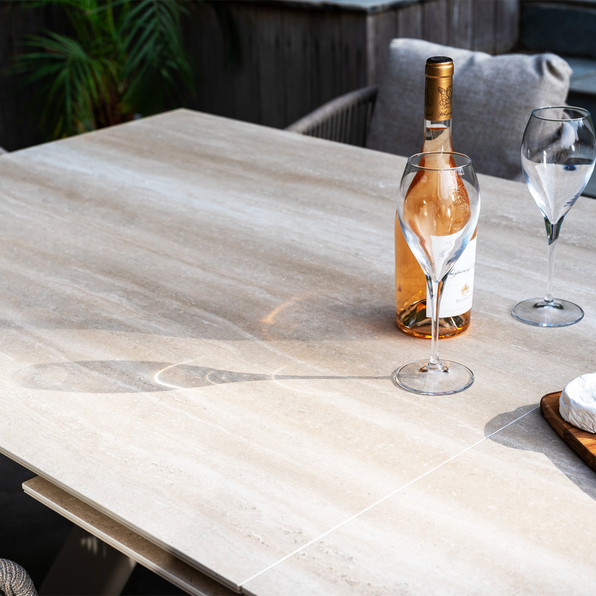The table that accompanies the Dekota dining set is manufactured from an aluminium leg frame and Ceramic Top.