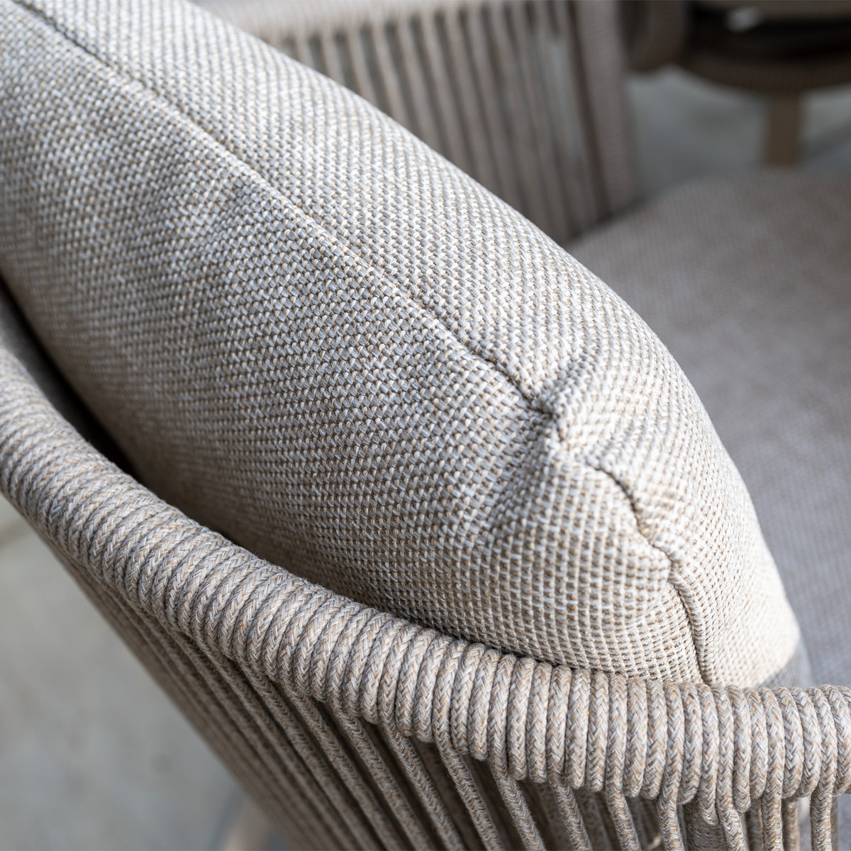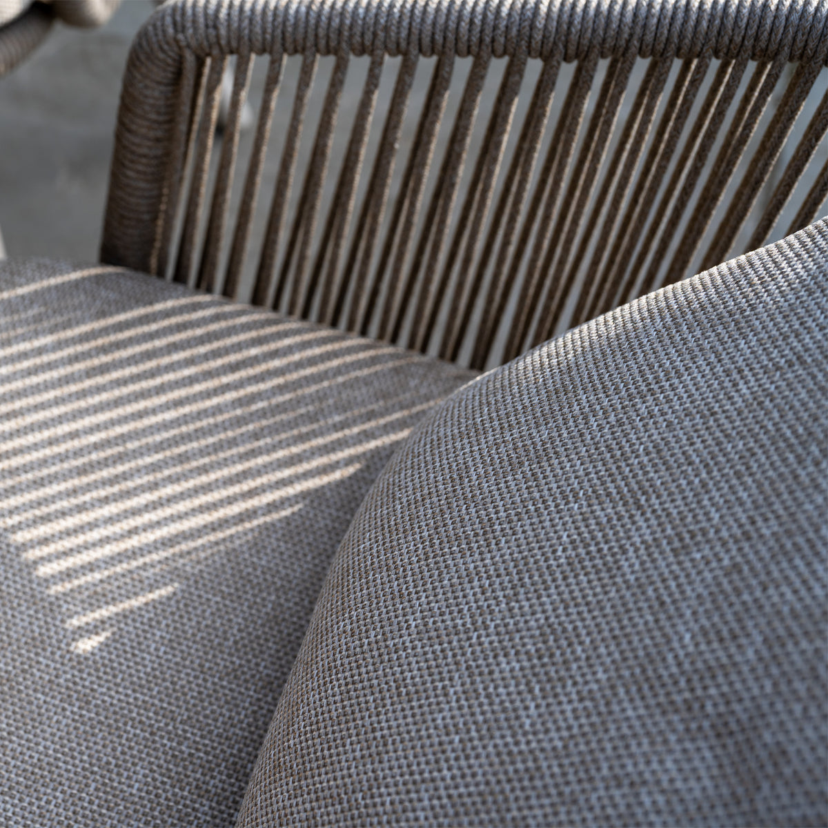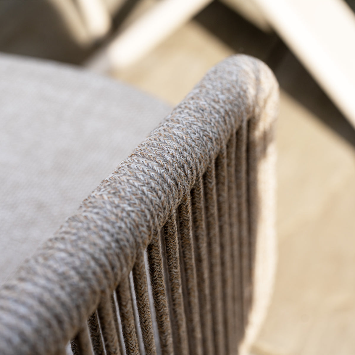 The Dekota chair has been ergonomically shaped with the use of an aluminium frame, meaning this set requires minimal maintenance. The aluminium frame is the entwined with a hydrophobic polyester rope weave, which is stylish and easy on the eye. Its fabric also features scratch and UV-resistant properties for your ease. In addition, the chair comes with a seat pad which is designed to provide further comfort.