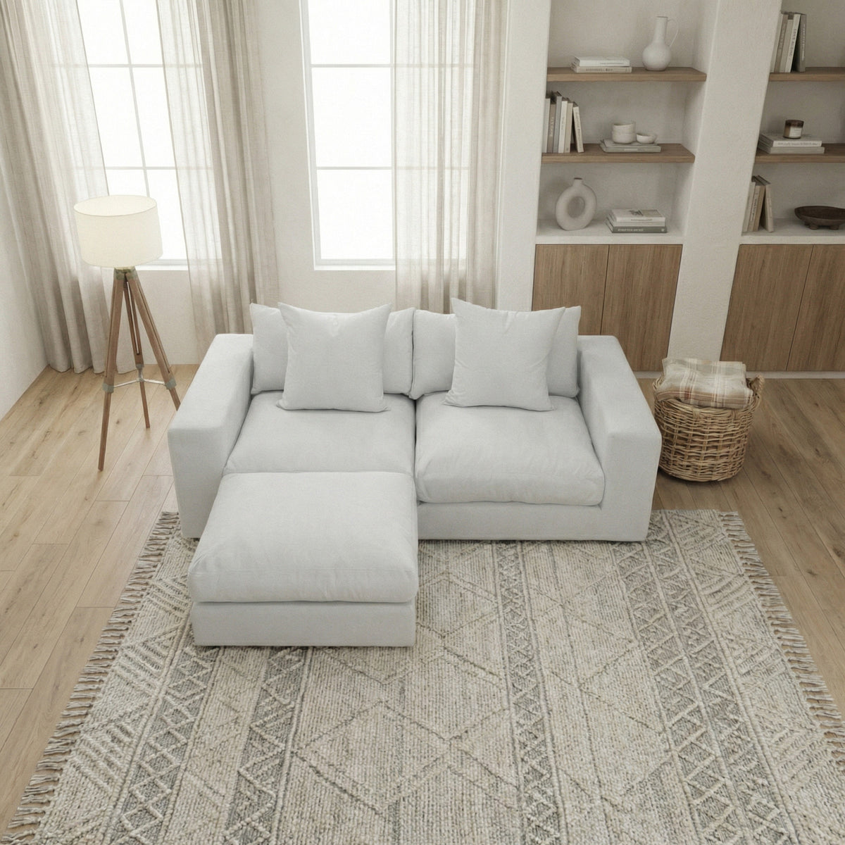 The Hampshire Modular Footstool in Dove Grey, handmade in England with linen-effect fabric, rests on a textured rug beside a blanket-draped sofa and a side table topped with a mug.