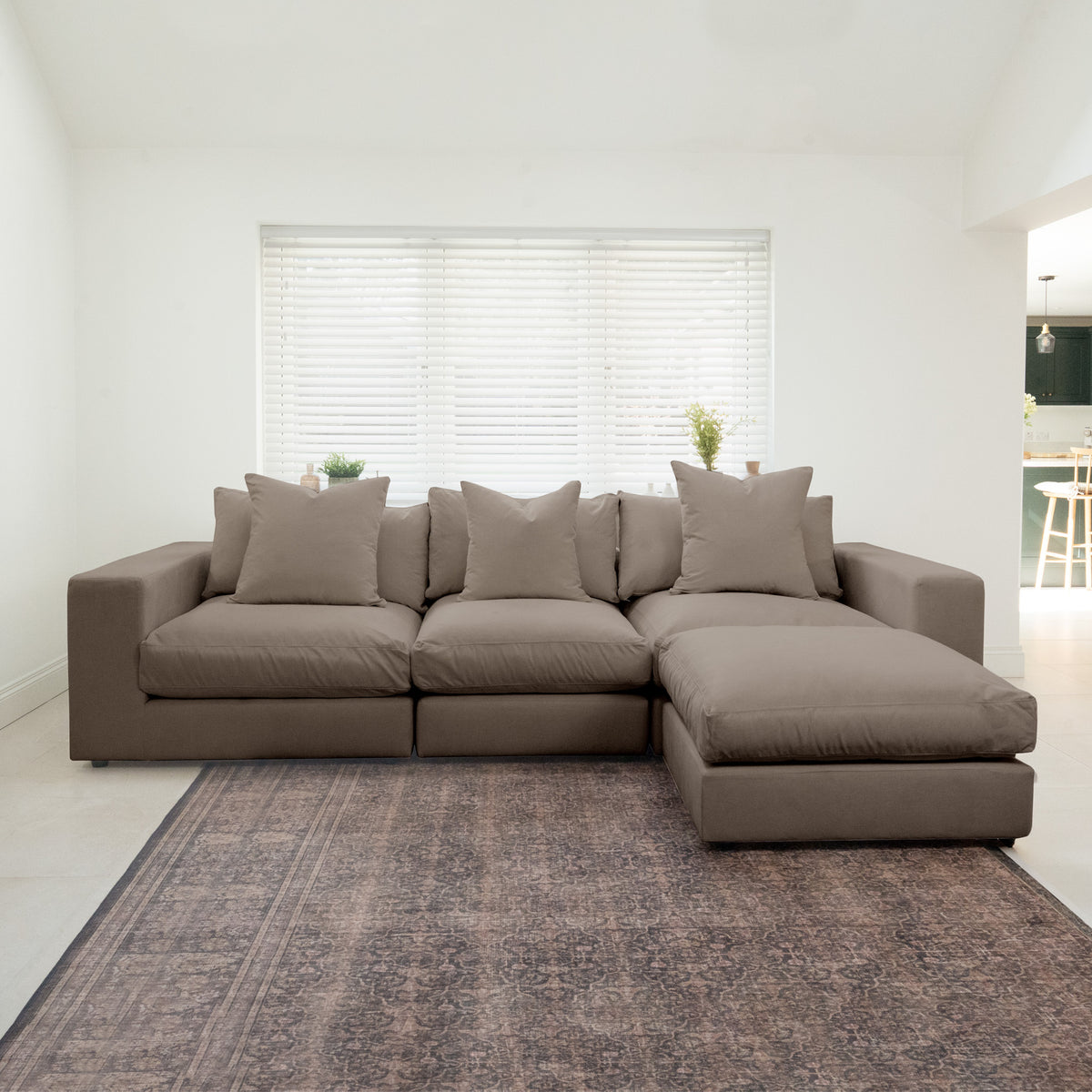 Cocoa Hampshire Modular Footstool with a plush cushion, placed on a patterned rug in a bright room with plants and décor on the window ledge; crafted from sustainably sourced hardwood for contemporary living.
