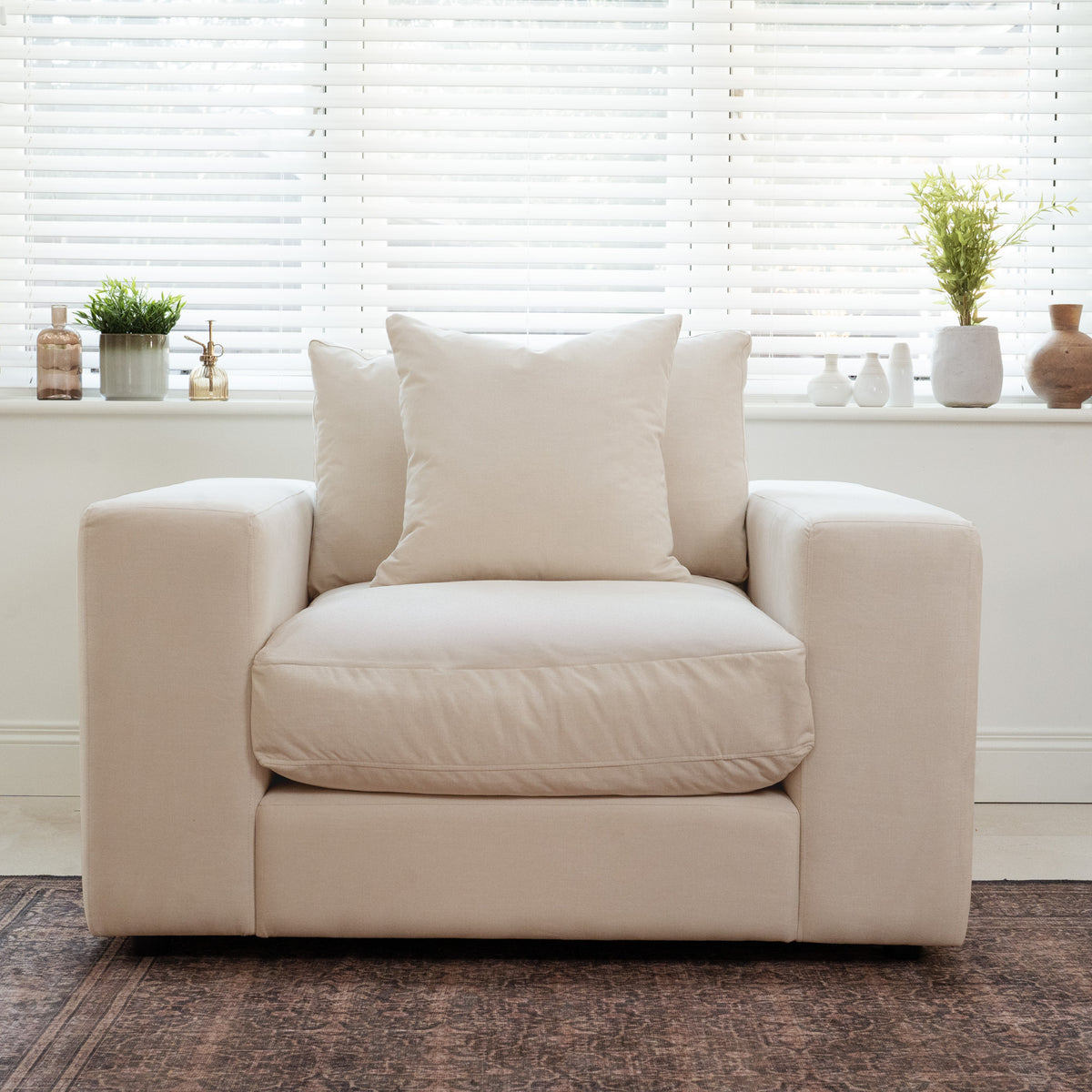 This armchair features luxurious duck feather and down cushions which offers you a soft and indulgent sink-in sitting experience. Built to last, the frame is constructed from sustainably sourced hardwood using traditional joinery techniques for enduring strength. Upholstered in a durable, linen-effect, warm beige fabric that’s scratch-resistant, this armchair is perfectly suited for busy family homes and everyday living.