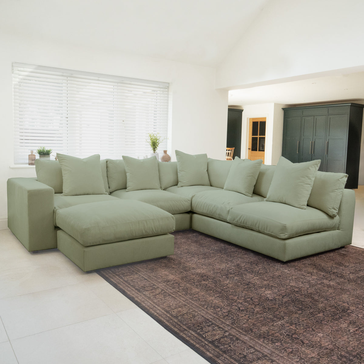 This sofa consists of one corner, arm piece, single and double middle piece; paired with a footstool that can be moved either left or right to allow you to configure the layout that best suits you. This sofa features luxurious duck feather and down cushions which offers you a soft and indulgent sink-in sitting experience. Built to last, the frame is constructed from sustainably sourced hardwood using traditional joinery techniques for enduring strength.