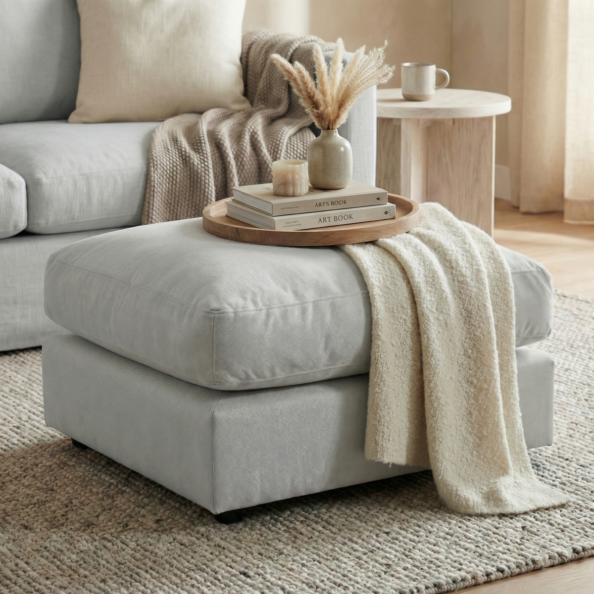 This footstool features a generously filled duck feather and down cushion, offering a soft and indulgent place to rest your feet or serve as additional seating. Built with a sustainably sourced hardwood frame using traditional joinery techniques, it promises enduring strength and durability. Upholstered in a durable, linen-effect dove grey fabric that’s both scratch-resistant and family-friendly, it’s made to withstand the demands of busy homes.