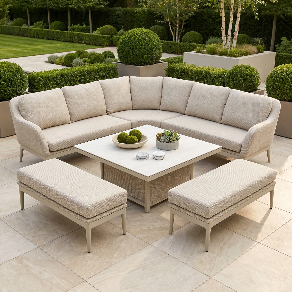 The set contains a curved corner sofa made from outdoor fabric and an elegant rising table. Designed to work perfectly both lounging or dining with the adjustable table.