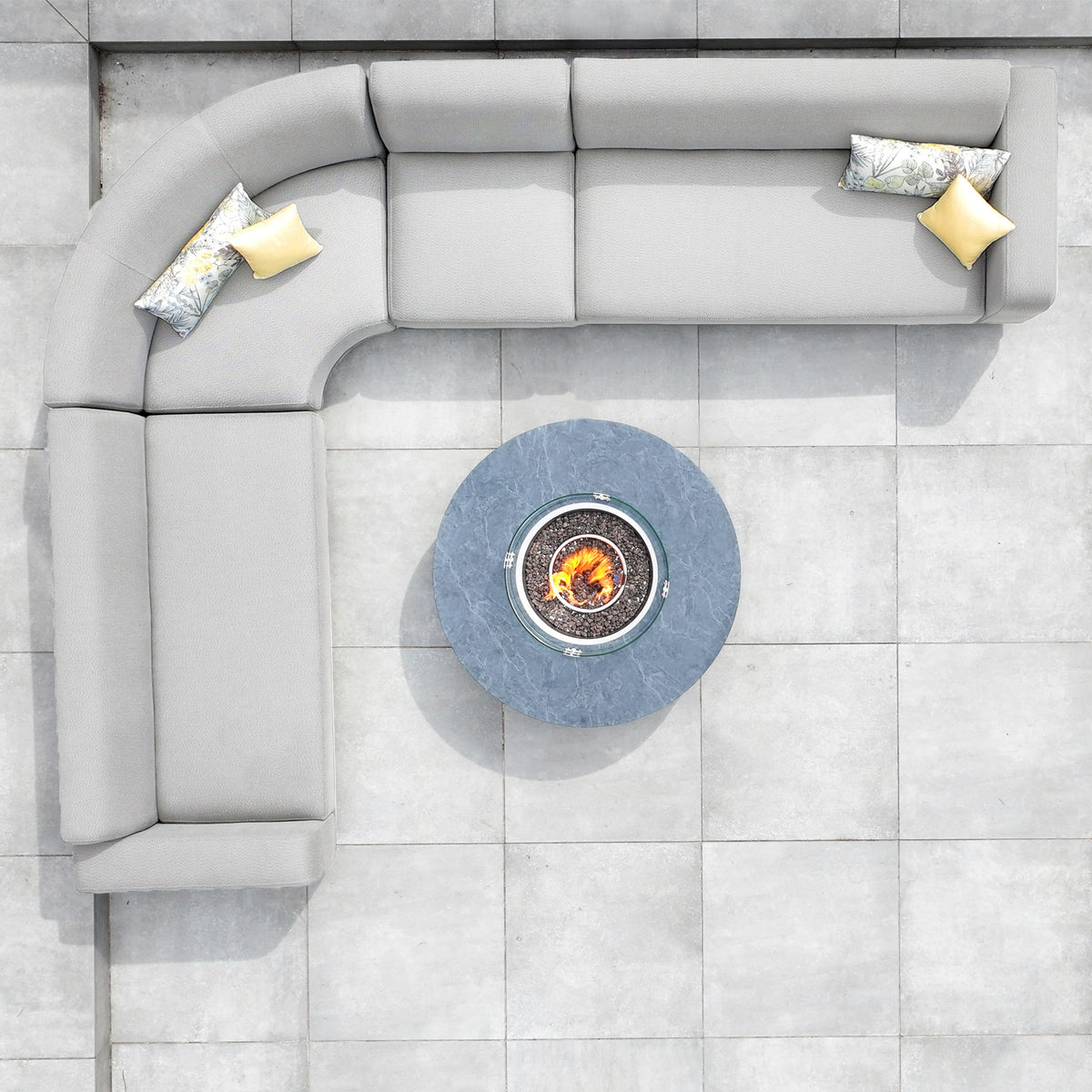 Luna Outdoor Fabric Large Curved Corner Group Set with Round Firepit Coffee Table in Oyster Grey