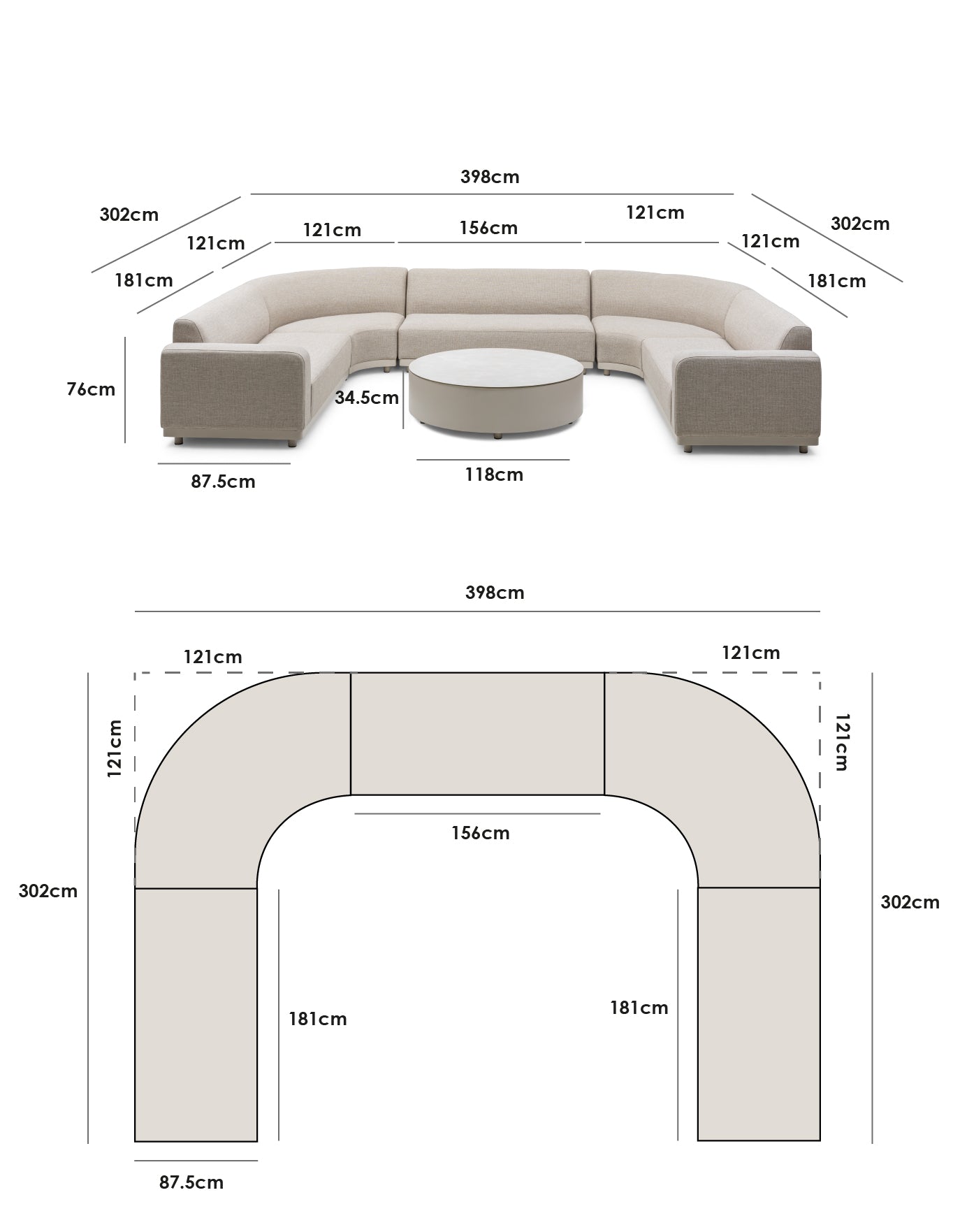 Curved Corner Piece: W121cm x D87.5cm x H76cm