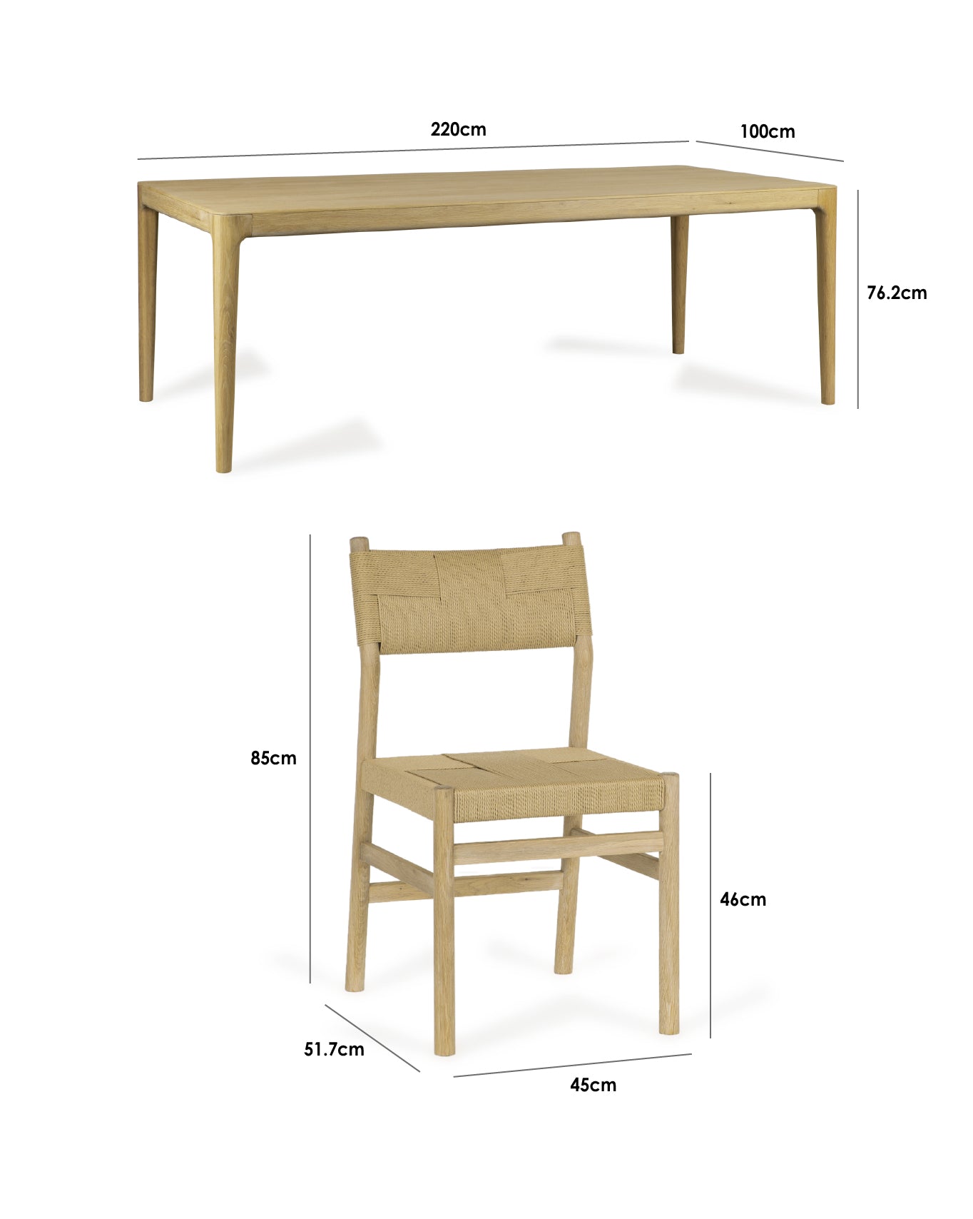 Dining Table: W220cm x D100cm x H76.2cm