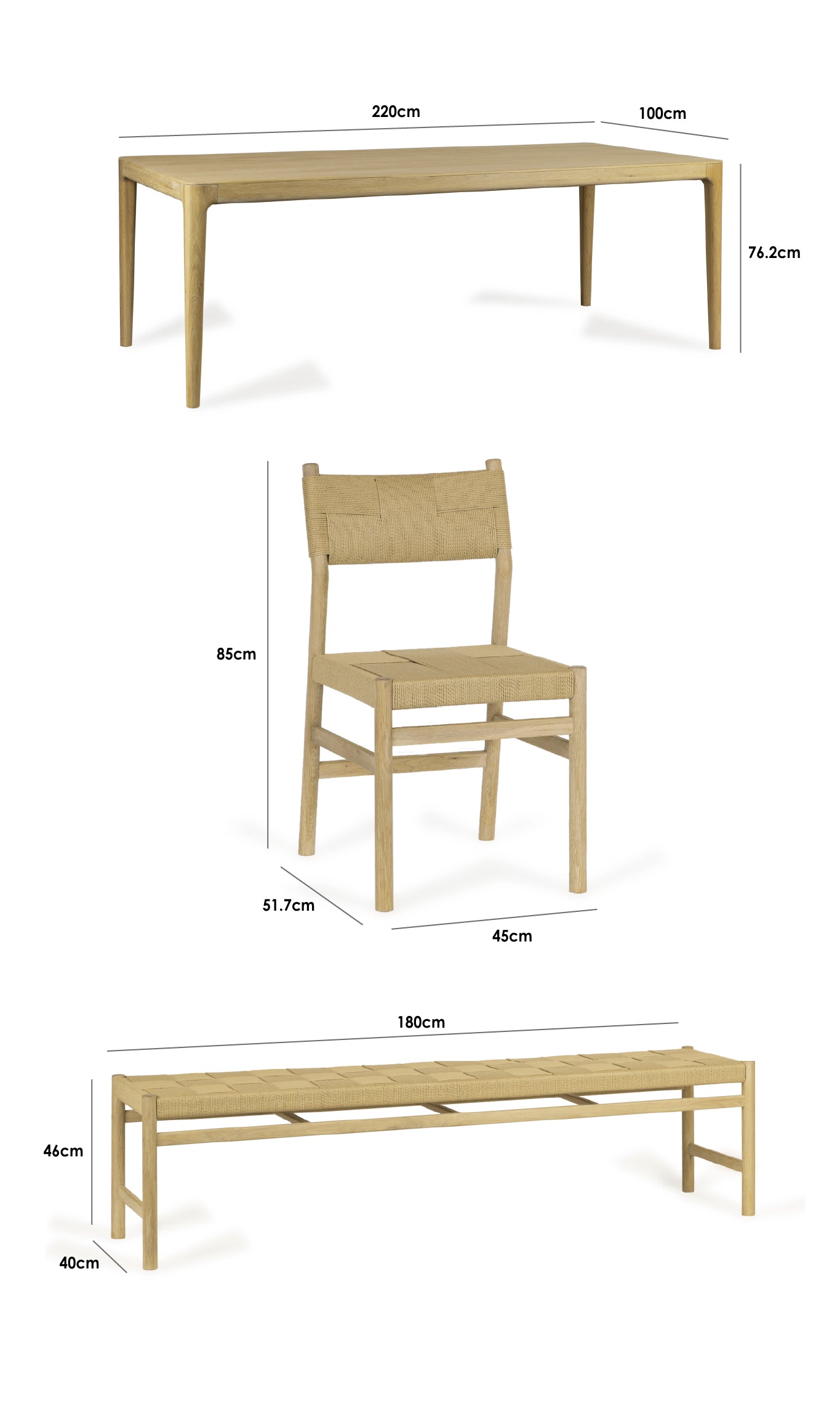Dining Table: W220cm x D100cm x H76.2cm