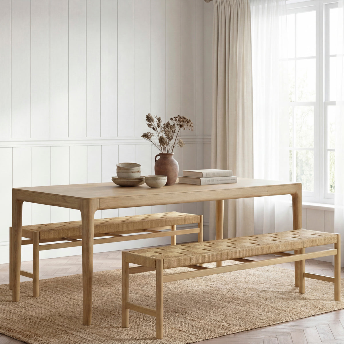 Marlow 8 Seat Dining Set with Woven Benches in Light Oak