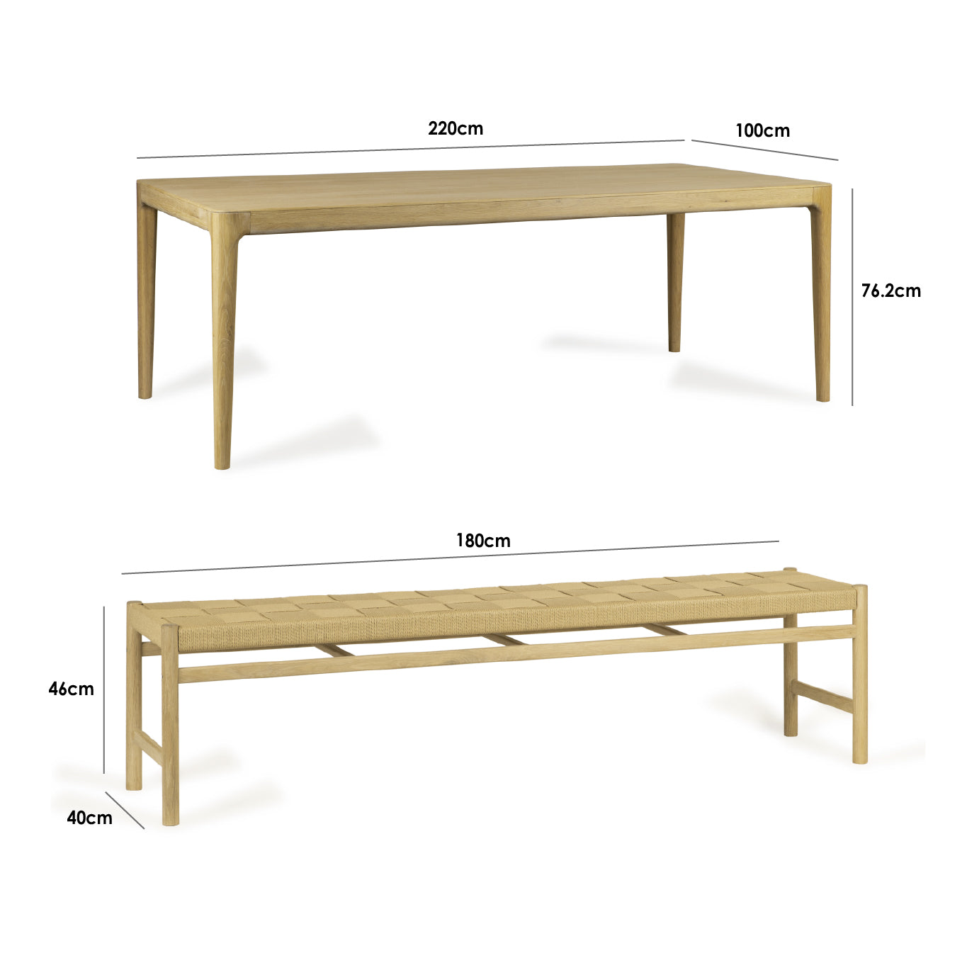 Dining Table: W220cm x D100cm x H76.2cm