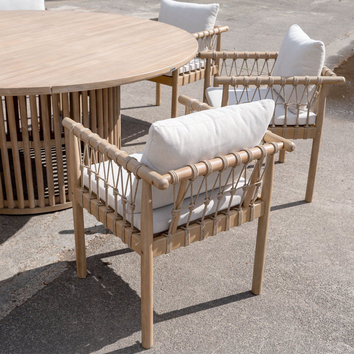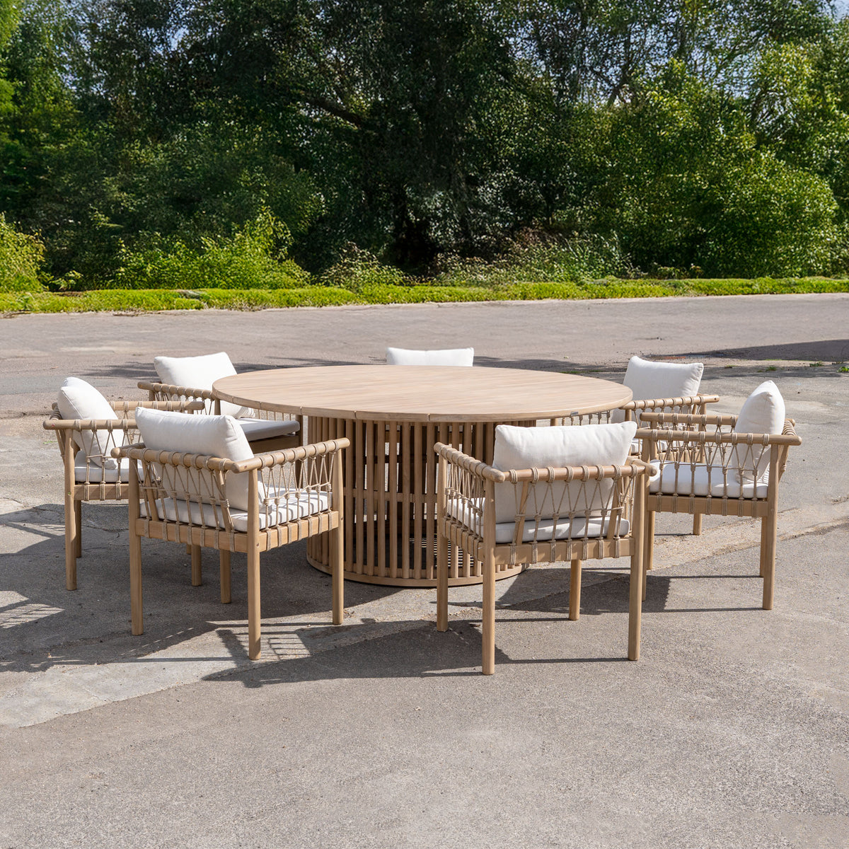 Create a stylish and welcoming alfresco dining space with the Paia 8 Seat Round Dining Set, crafted from sustainably sourced Acacia wood with a light, natural finish that highlights the beauty of the grain. Designed to bring people together, the generously sized round table comfortably seats up to seven, making it perfect for everything from relaxed meals to special celebrations. Each chair features a square-inspired seat with gently curved arms and a slatted, rope-woven backrest, combining comfort with detailed craftsmanship. Soft, water-resistant cushions in a timeless ‘Linen’ shade provide added comfort and a neutral look that complements the wood’s warm tones. Built to withstand the elements, this durable yet elegant set is the perfect centrepiece for outdoor dining, offering a blend of functionality and style for memorable moments all season long.