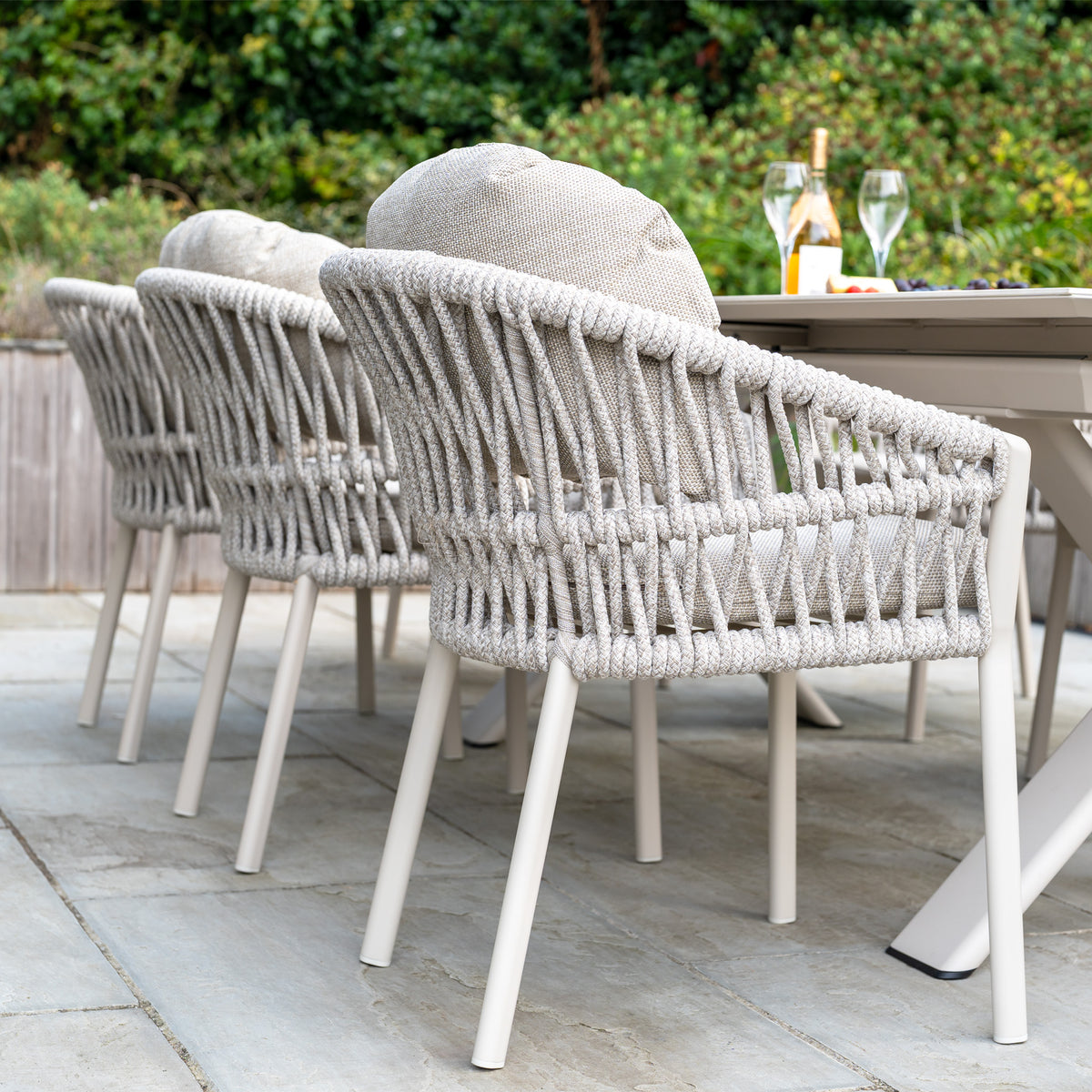 This set features eight Pello dining chairs, meticulously designed for all-day comfort and modern appeal. Each chair features a sophisticated vertical woven rope pattern, adding subtle texture and visual interest. The ropes are made from advanced hydrophobic fibres that repel water and resist fading as well as weather damage by allowing raindrops to simply roll off, helping keep your chairs fresh and ready for use throughout the seasons.