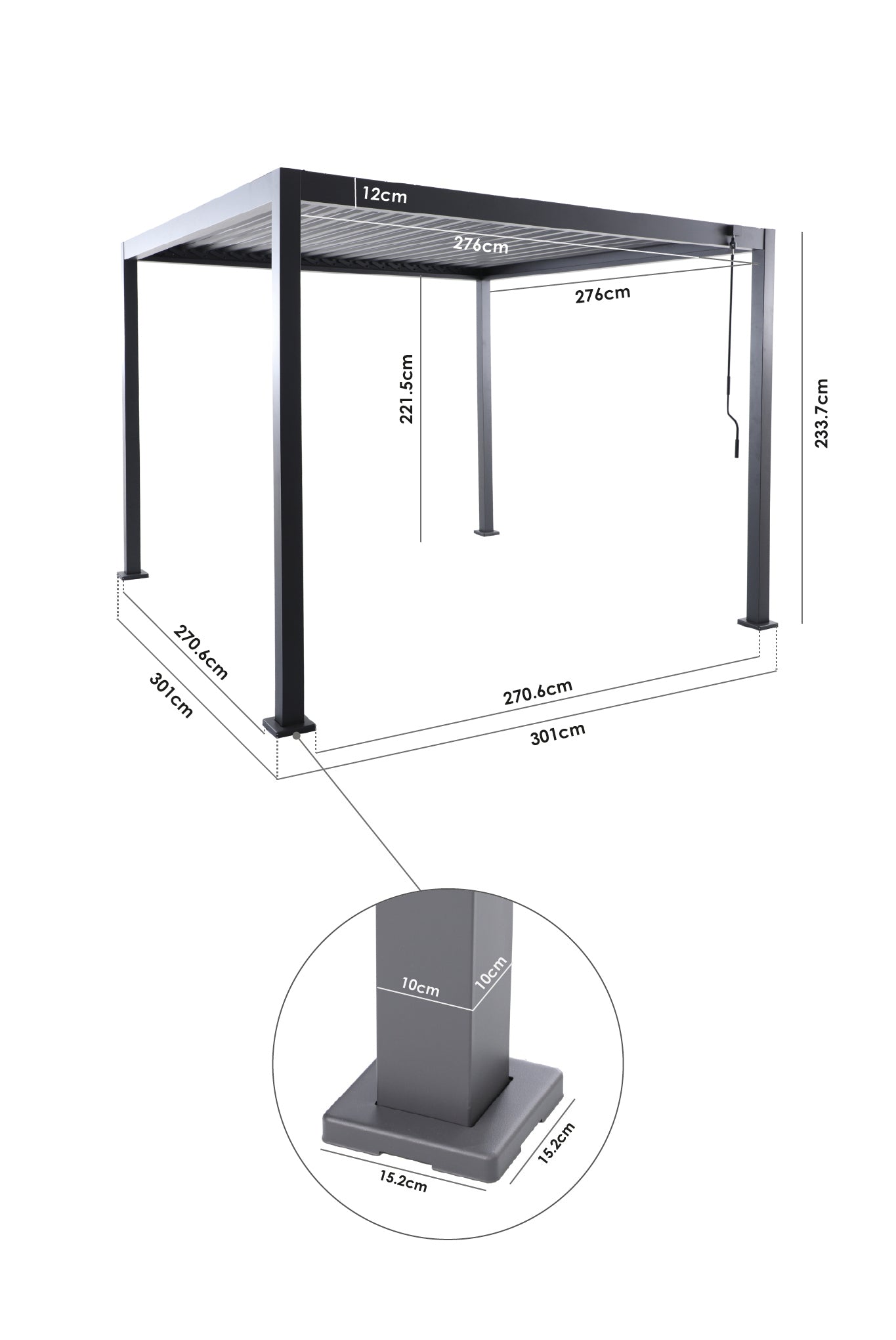 Assembly Required: We recommend 2-3 people to assemble, with an estimated assembly time of approximately 2-3 hours depending on skill level. PergoSTET pergolas must be installed on level surfaces to ensure the drainage system works efficiently; patios with a standard 1:80 fall for surface water runoff are acceptable, but significantly steeper falls may affect performance and void warranties. Once assembled, secure the pergola to the floor immediately using the provided bolts to maintain structural integrity and prevent beams from shifting. Unsecured feet leave the pergola vulnerable to movement, compromising durability and safety. Assemble during suitable weather conditions to minimize risks and ensure a safe and successful installation.