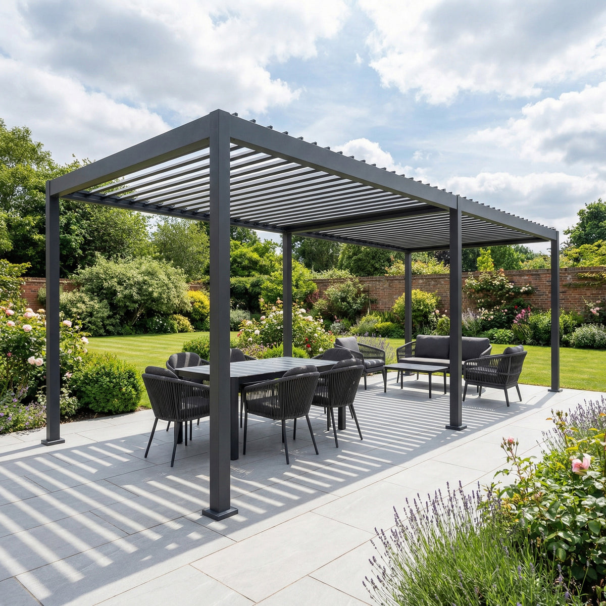 Assembly takes approximately 3-4 hours with 2/3 people. The pergola must be installed on a solid, level surface, and bolting the structure down immediately after construction is essential to prevent movement and ensure long-term stability.