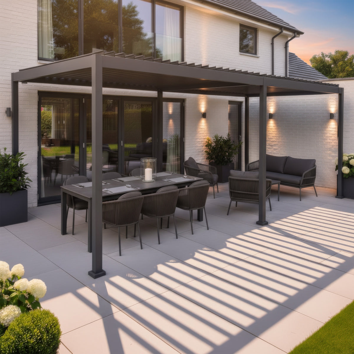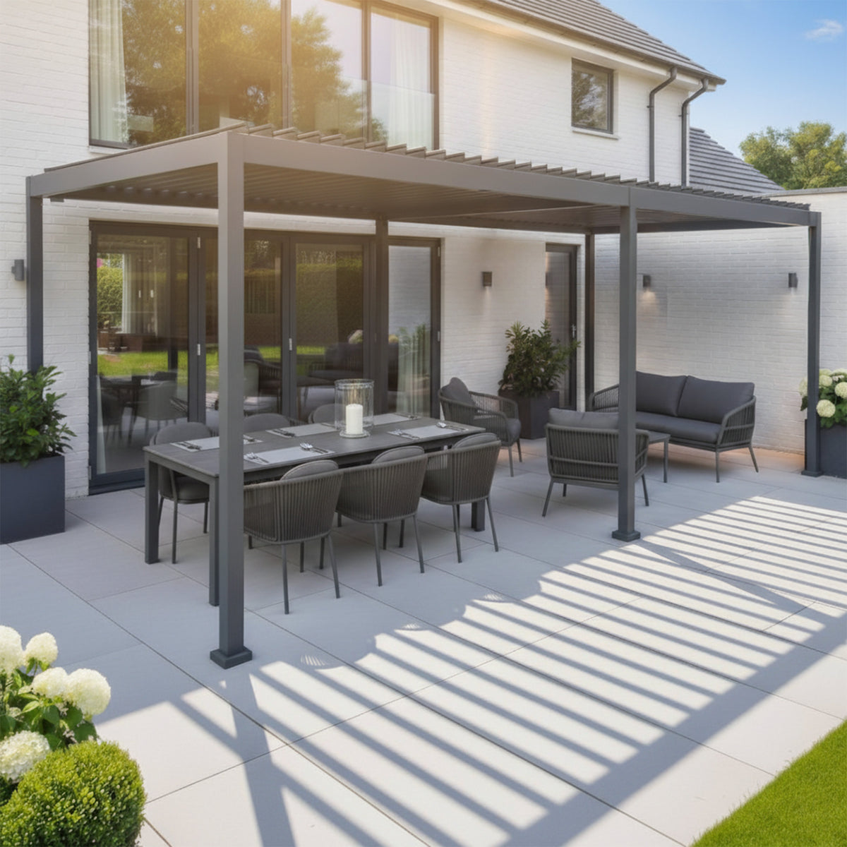 The PergoSTET Lite Neo 3m x 7m Pergola is the largest model in the Lite Neo collection, delivering expansive coverage and the same signature PergoSTET performance. Designed exclusively for Harbour Lifestyle, this alu/steel structure provides adaptable shade and weather protection, making it ideal for creating a sizeable dining, lounging or multifunctional outdoor area. The manually tilting steel louvres allow you to switch between open and closed positions with ease, giving you control over sunlight, airflow and shelter throughout the day.