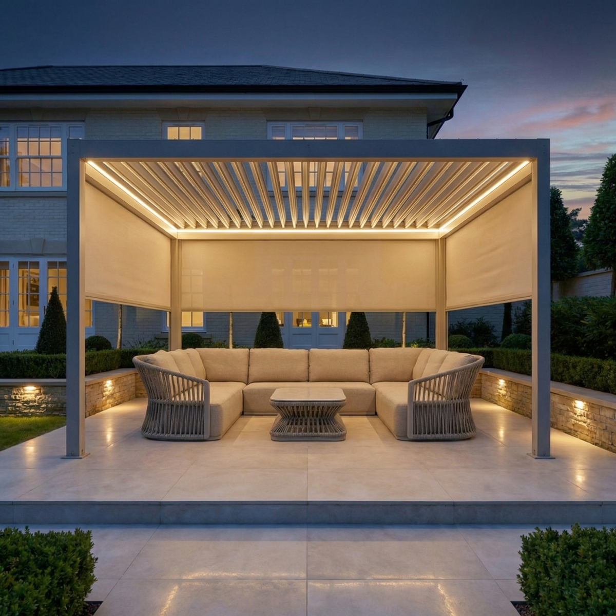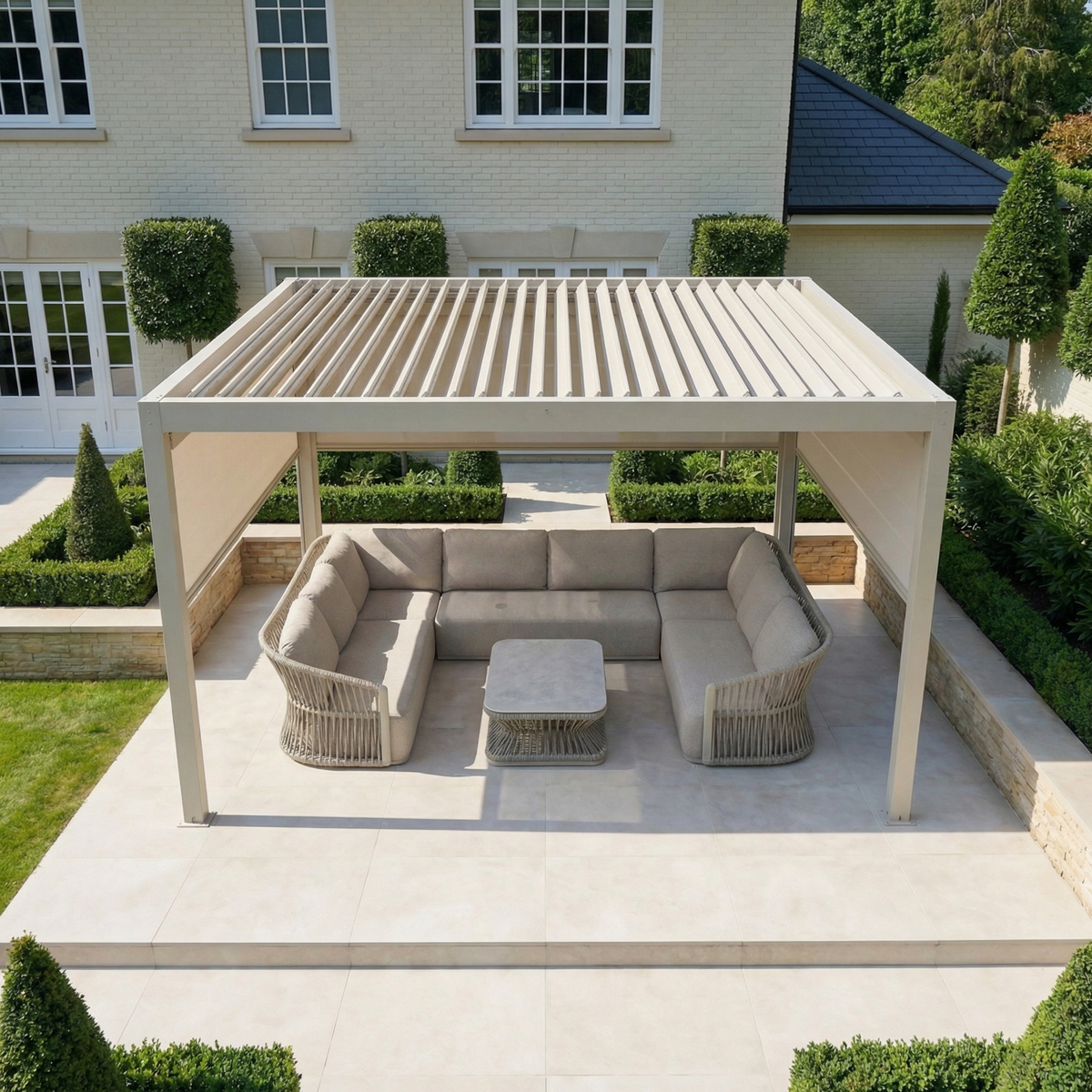 PergoSTET Plus 4m x 4m Square Pergola with 3 Manual Side Blinds and LED Lighting in Latte