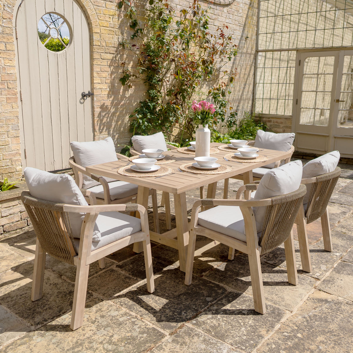 With rope a Mocha detailing along the six dining chairs and a stylish new colour way, the eucalyptus frame adds a contemporary touch to this set. In the centre of this set, a robust yet classically beautiful table, to enjoy all seasons for any occasion.