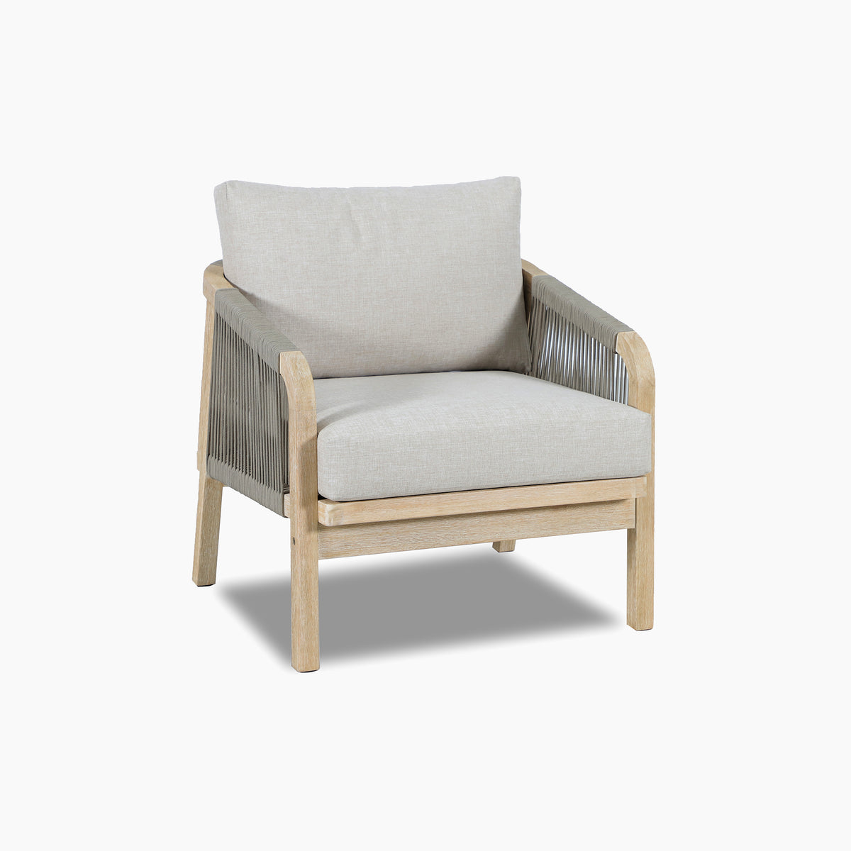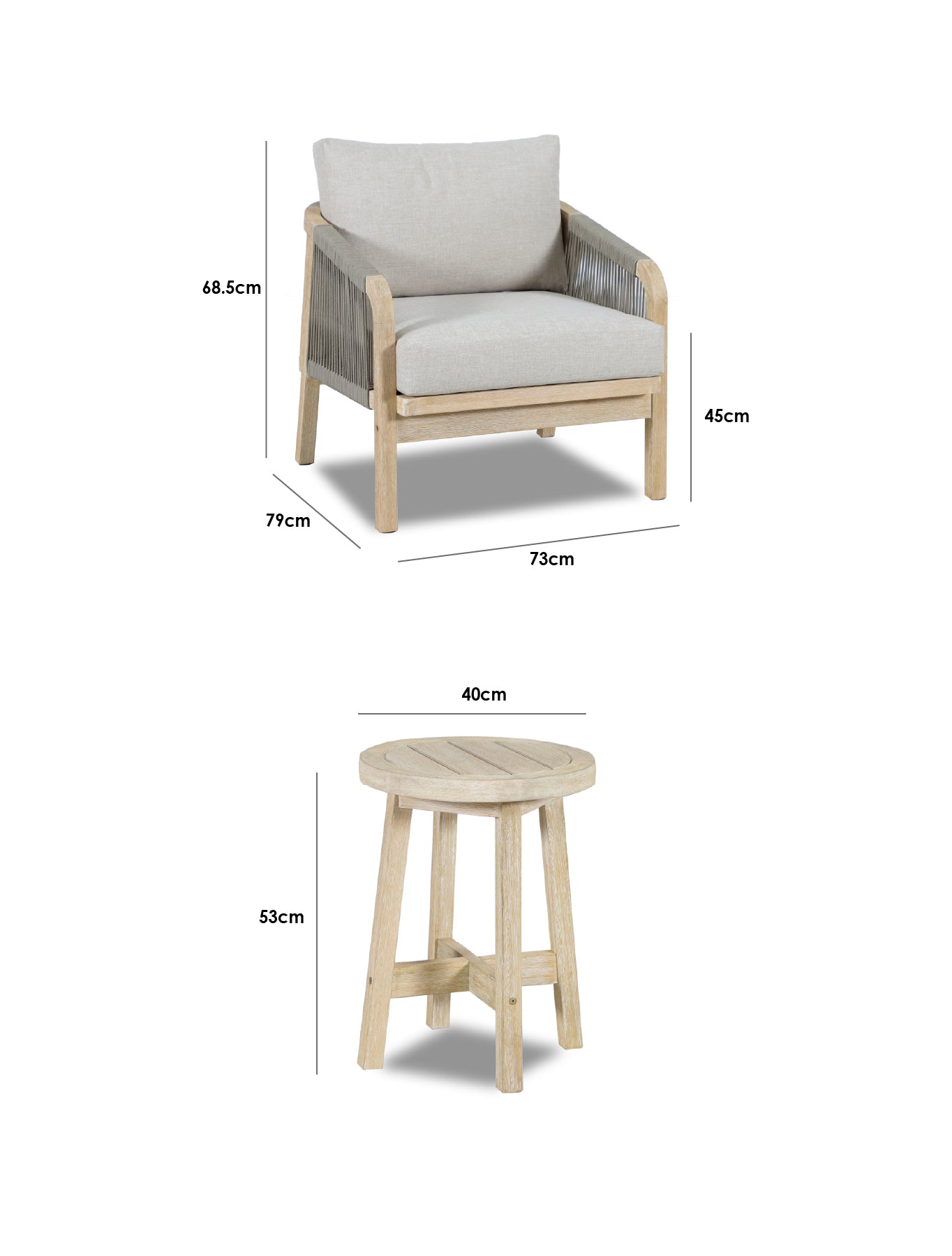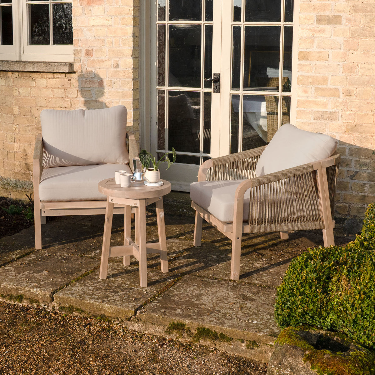 This versatile set, complete with a two armchairs and side table, offers a peaceful space for the whole family to relax. The Mocha rope detailing and eucalyptus wood finished in a subtle whitewash ensure seamless compatibility with a wide range of garden styles. Designed for long-lasting performance, the Olefin cushion material with quick drying inner incorporates modern water-resistant polyester technology that enhances strength and comfort.