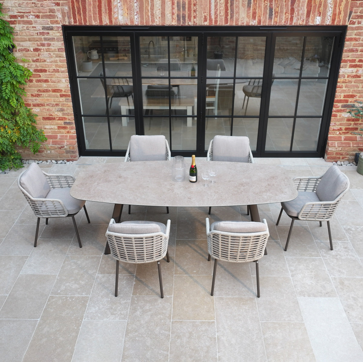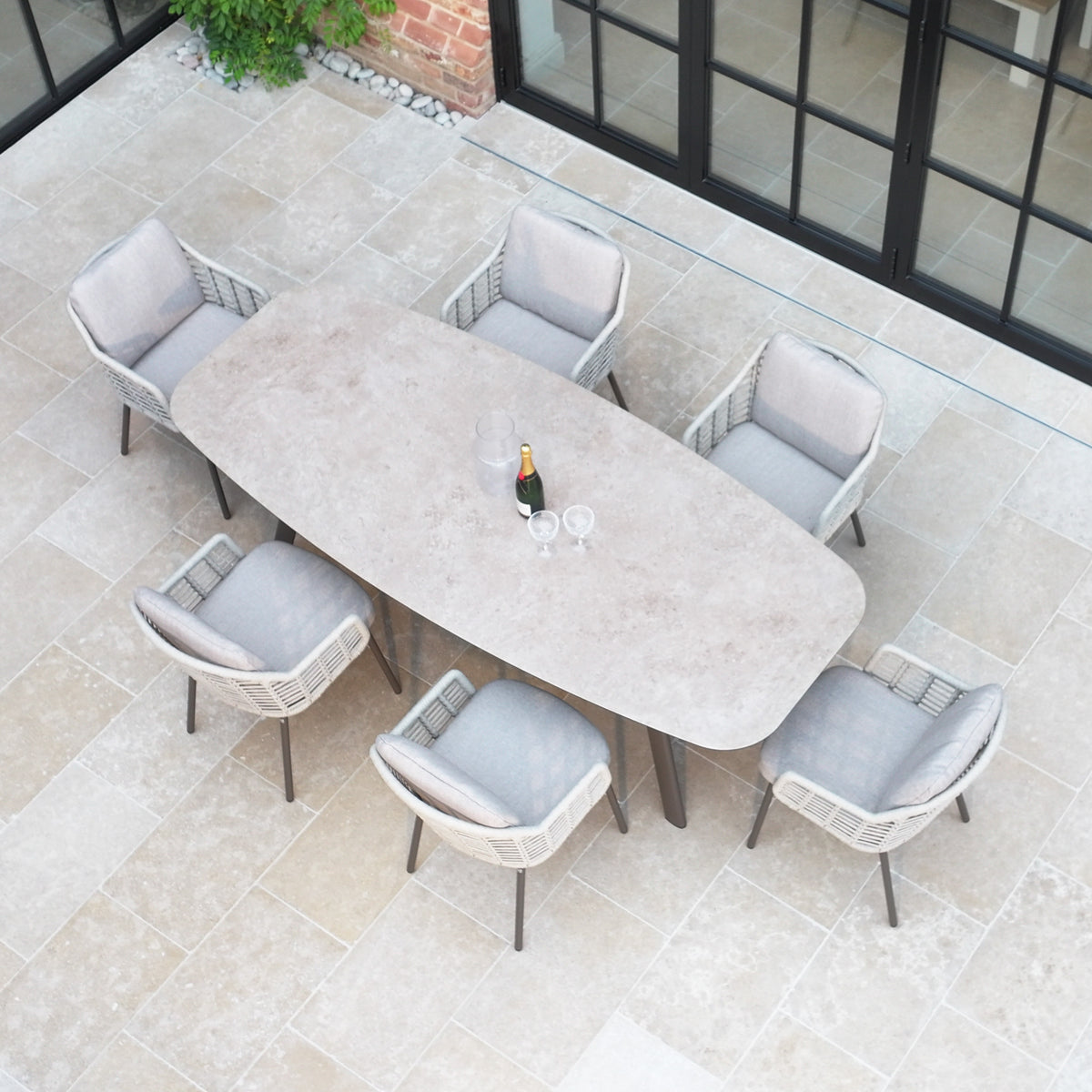 Introducing the Sutera 6 Seat Curved Rectangular Dining Set- bringing a sense of natural beauty and relaxed sophistication to any outdoor setting.