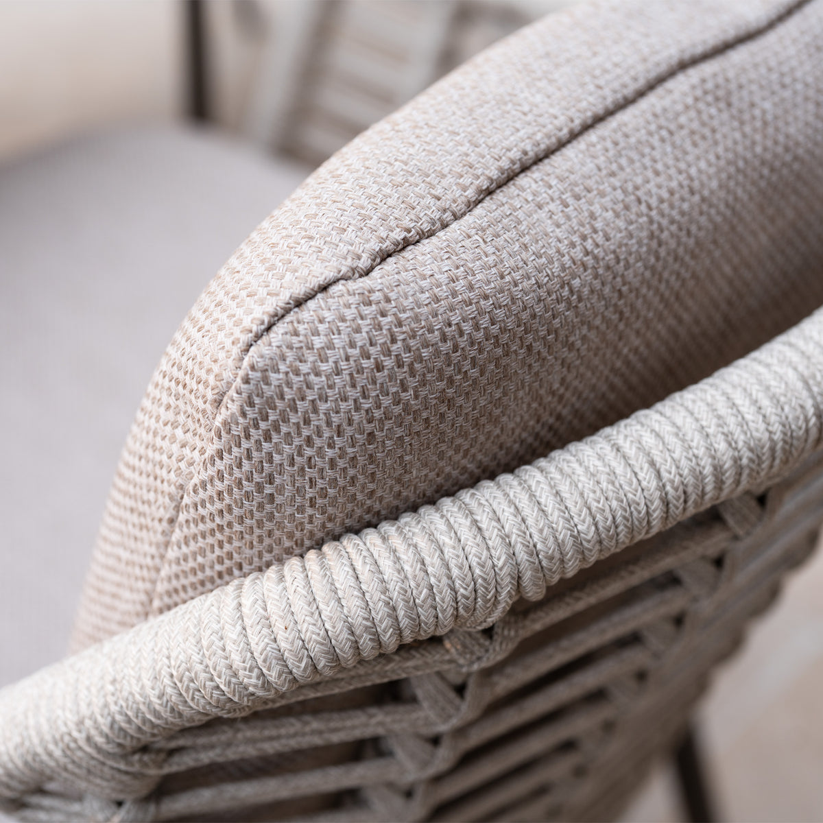 The chairs feature soft and neutral putty toned cushions, paired with a terre-coloured frame, creating a gentle balance of warmth and contemporary style. The intricate rope design and organic shapes echo the signature character of the Sutera collection, making the set a perfect fit for gardens filled with earthy hues, textured planting, and calm, natural surroundings. The rope features a polyethylene core and Olefin sheath; this combination ensures strength, durability and soft appearance.