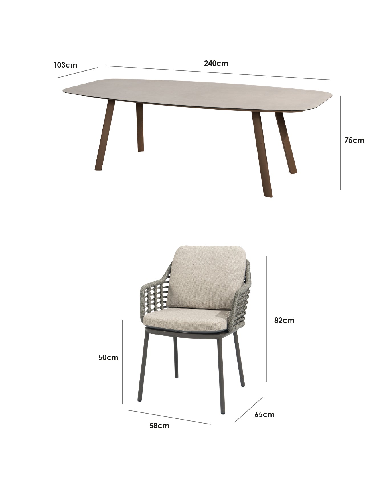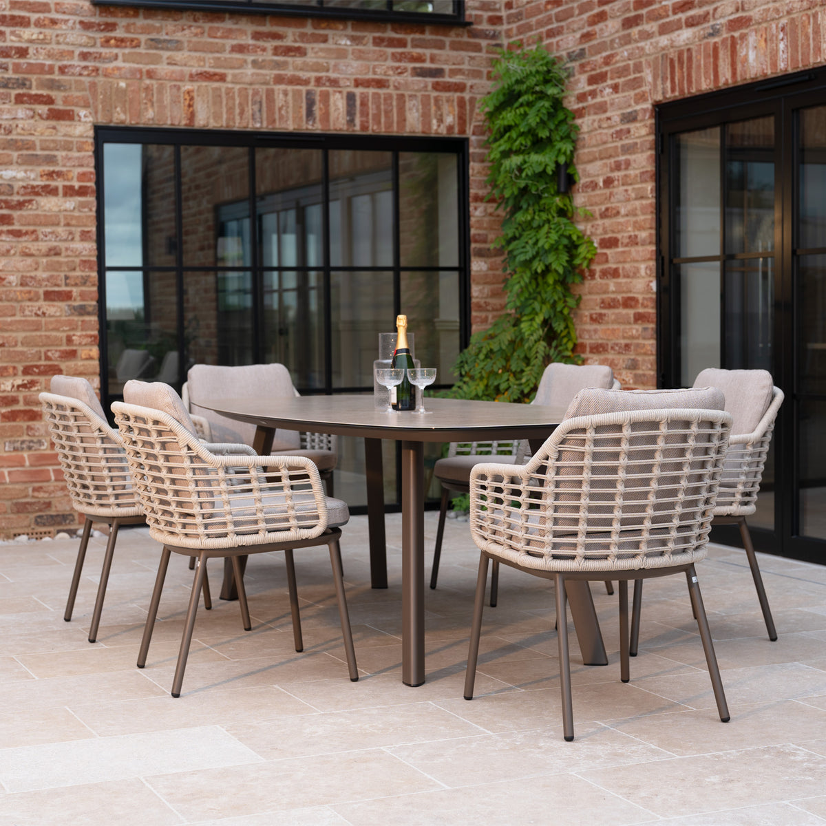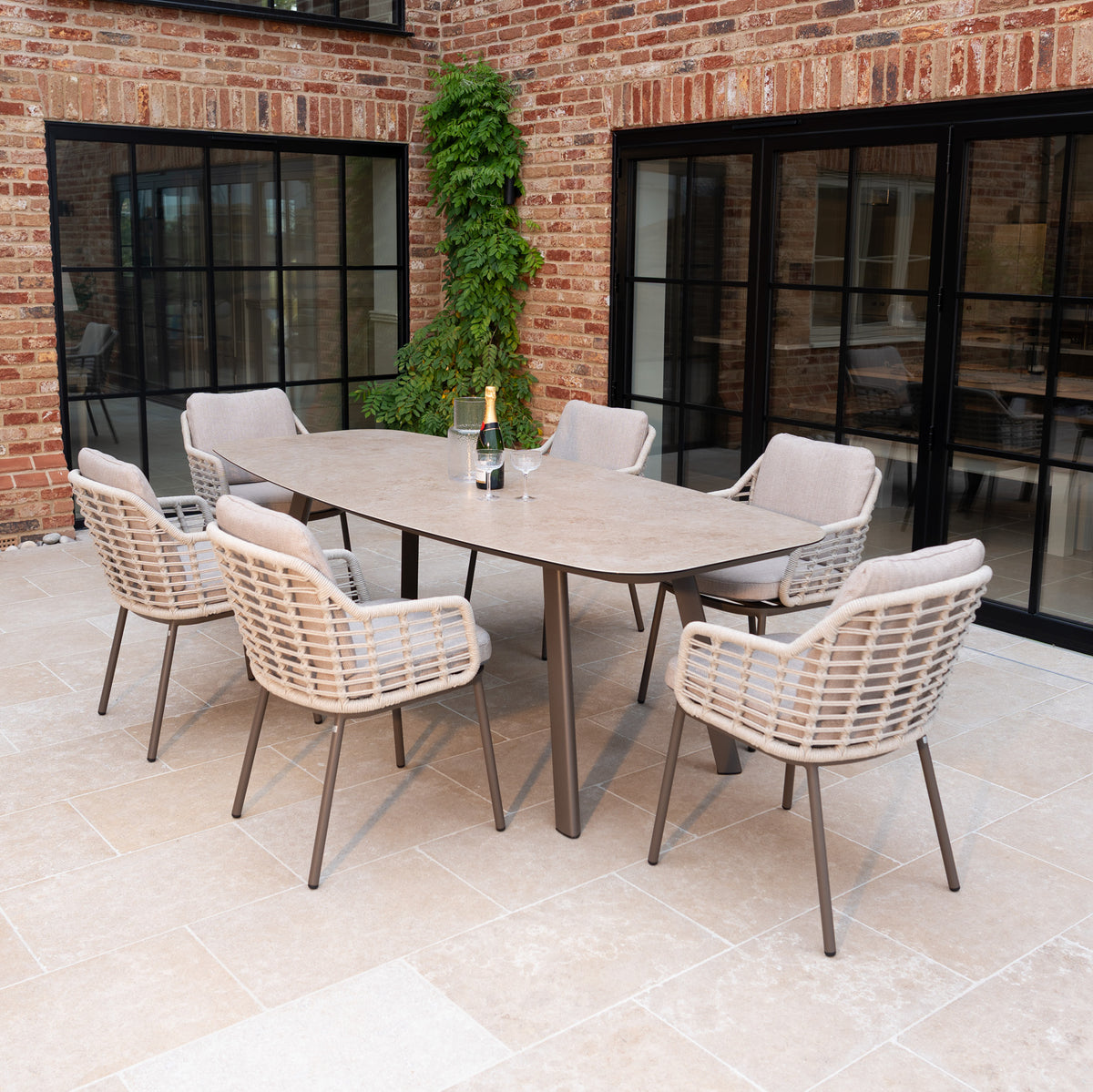 Introducing the Sutera 6 Seat Curved Rectangular Dining Set- bringing a sense of natural beauty and relaxed sophistication to any outdoor setting. The chairs feature soft and neutral putty toned cushions, paired with a terre-coloured frame, creating a gentle balance of warmth and contemporary style. The intricate rope design and...