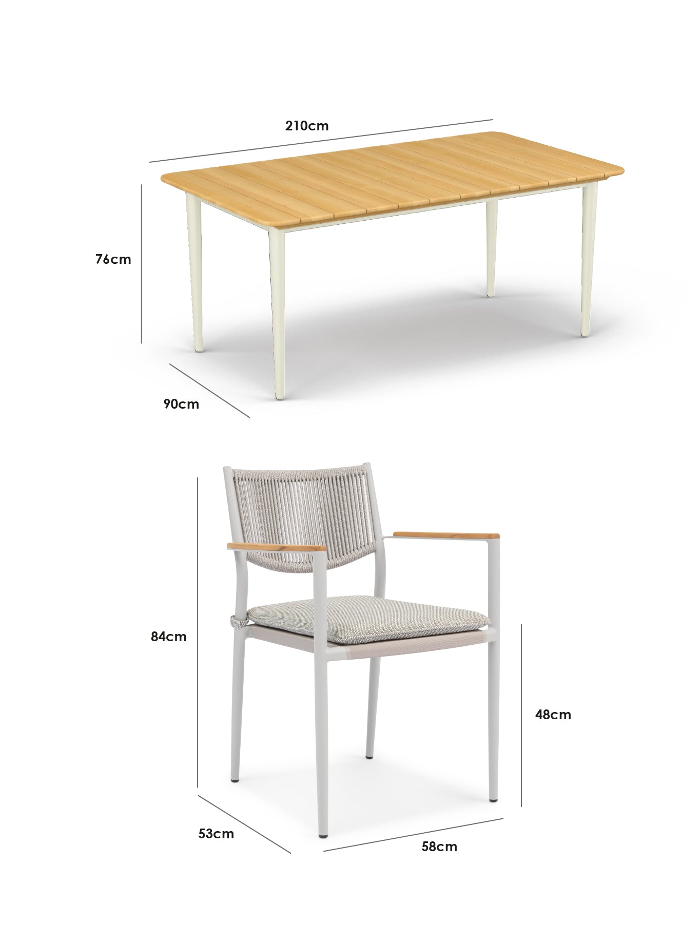 The dining chairs are stackable and designed with powder-coated aluminium frames that provide a sleek, modern look while being weather-resistant. The backrests are intricately woven with weatherproof rope, adding a textured element while offering comfortable support. Natural teak accents on the armrests bring a touch of warmth and refinement, perfectly balancing the contemporary design.