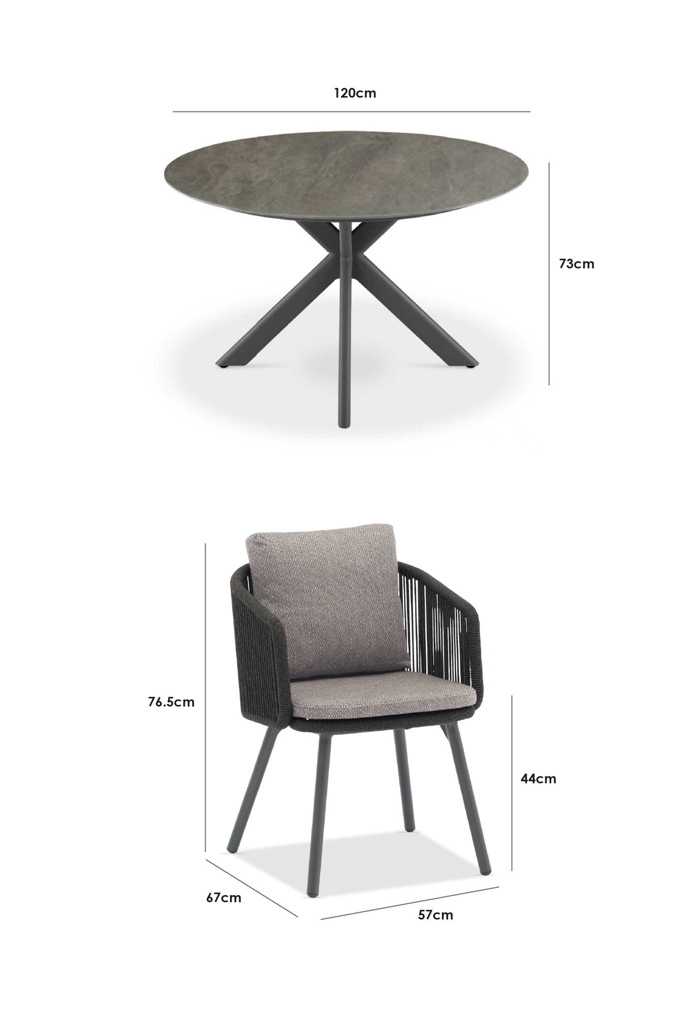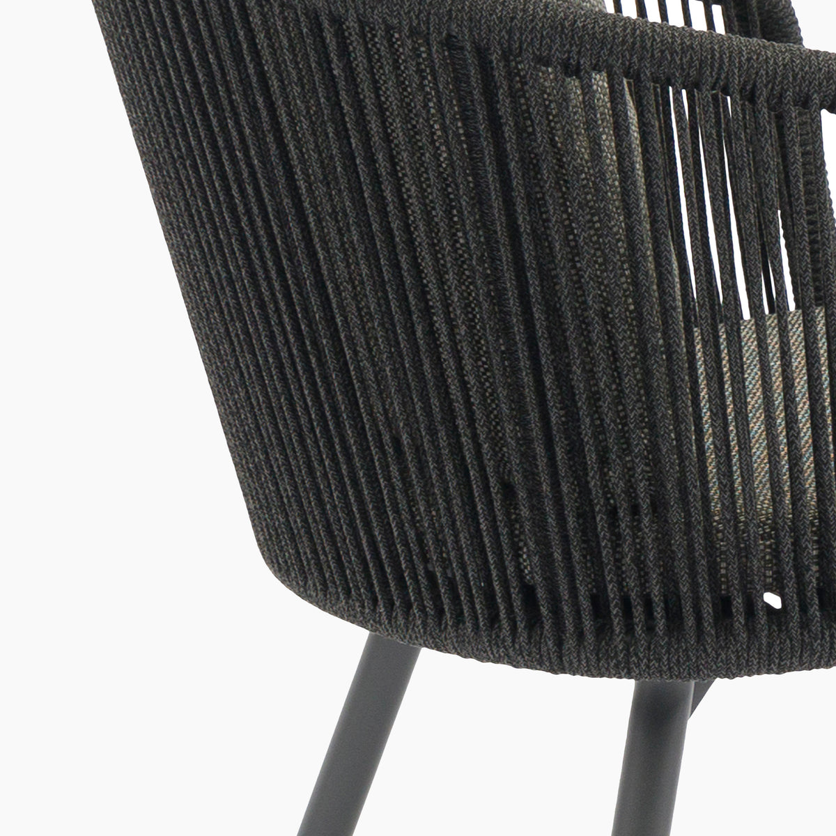 The table is crafted from sturdy aluminium with a premium powder coating, giving lasting durability and reassurance against the elements. The chairs are wrapped in woven olefin rope with gently curved backrests that add shape and depth while keeping the look relaxed and understated. Each one is finished with a seat pad for comfort, and the fabric itself is both scratch and UV resistant, making it as practical as it is elegant.