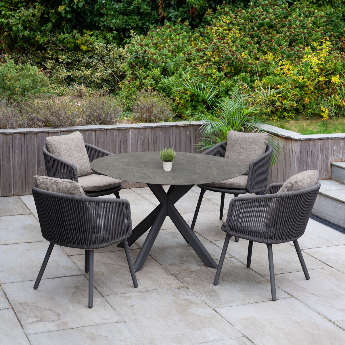 The Theia 4 Seat Round Rope Dining Set with Albatross Table in Truffle is designed to bring both beauty and ease to outdoor dining. A considered balance of strength and softness, it becomes a natural focal point for any garden. The table is crafted from sturdy aluminium with a premium...