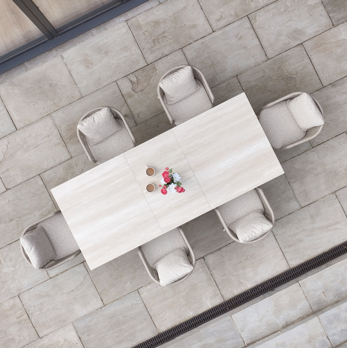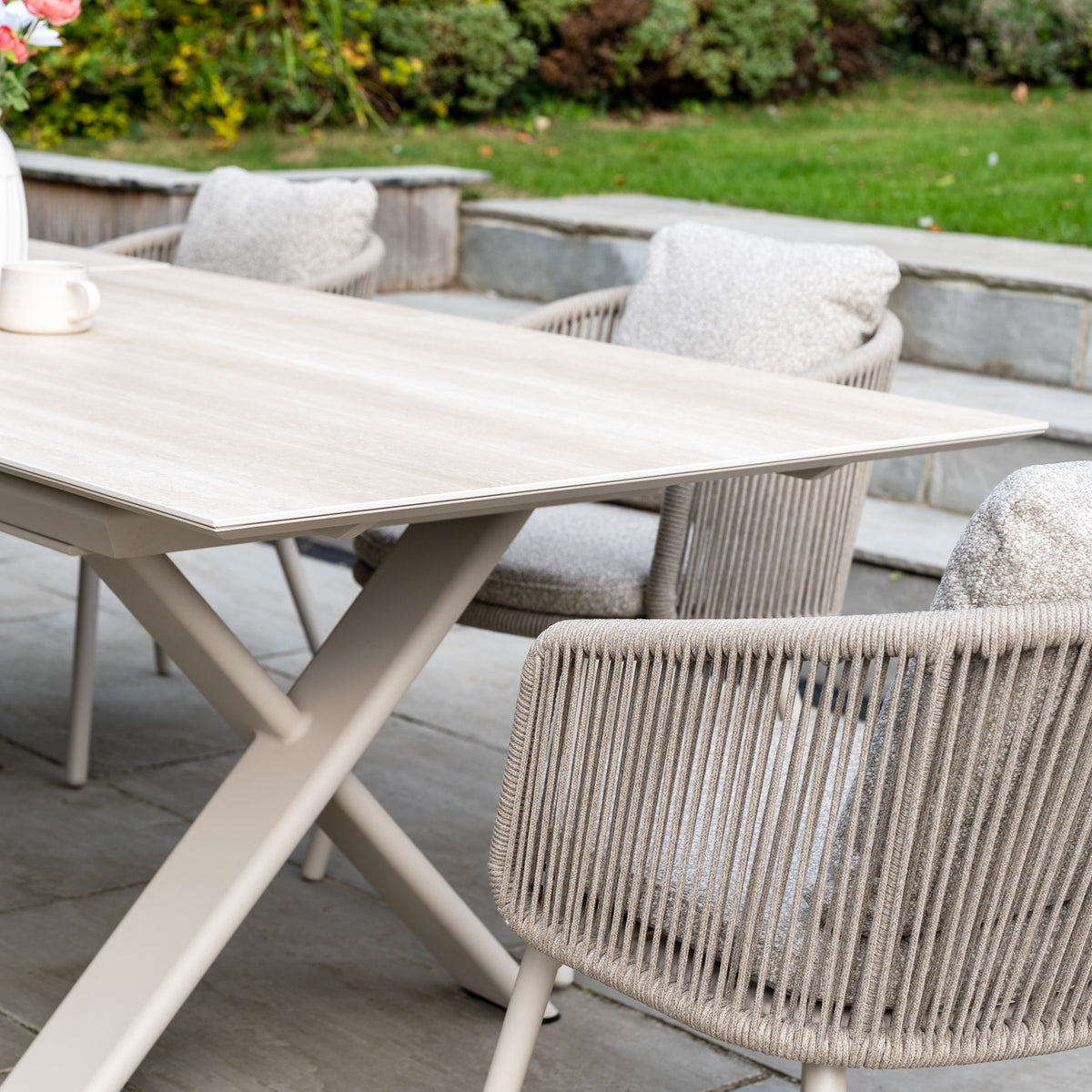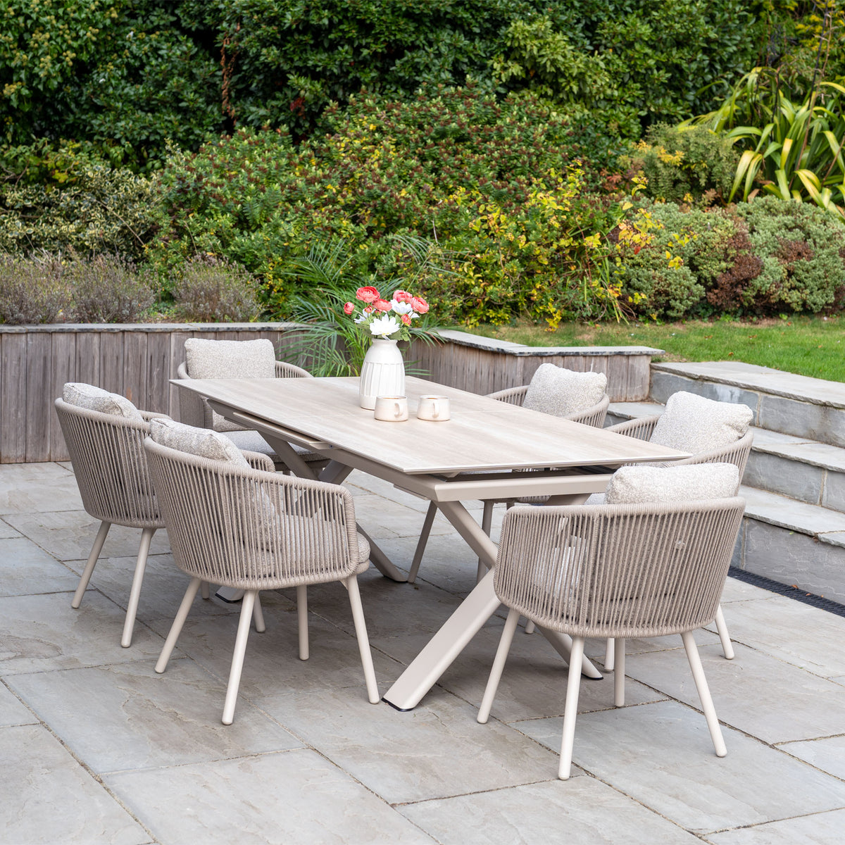 Harbour Lifestyles Theia 6 Seat Rope Dining Set with Albatross Extending Table in Oatmeal is designed to be the perfect balance of beauty and practicality for your garden.
