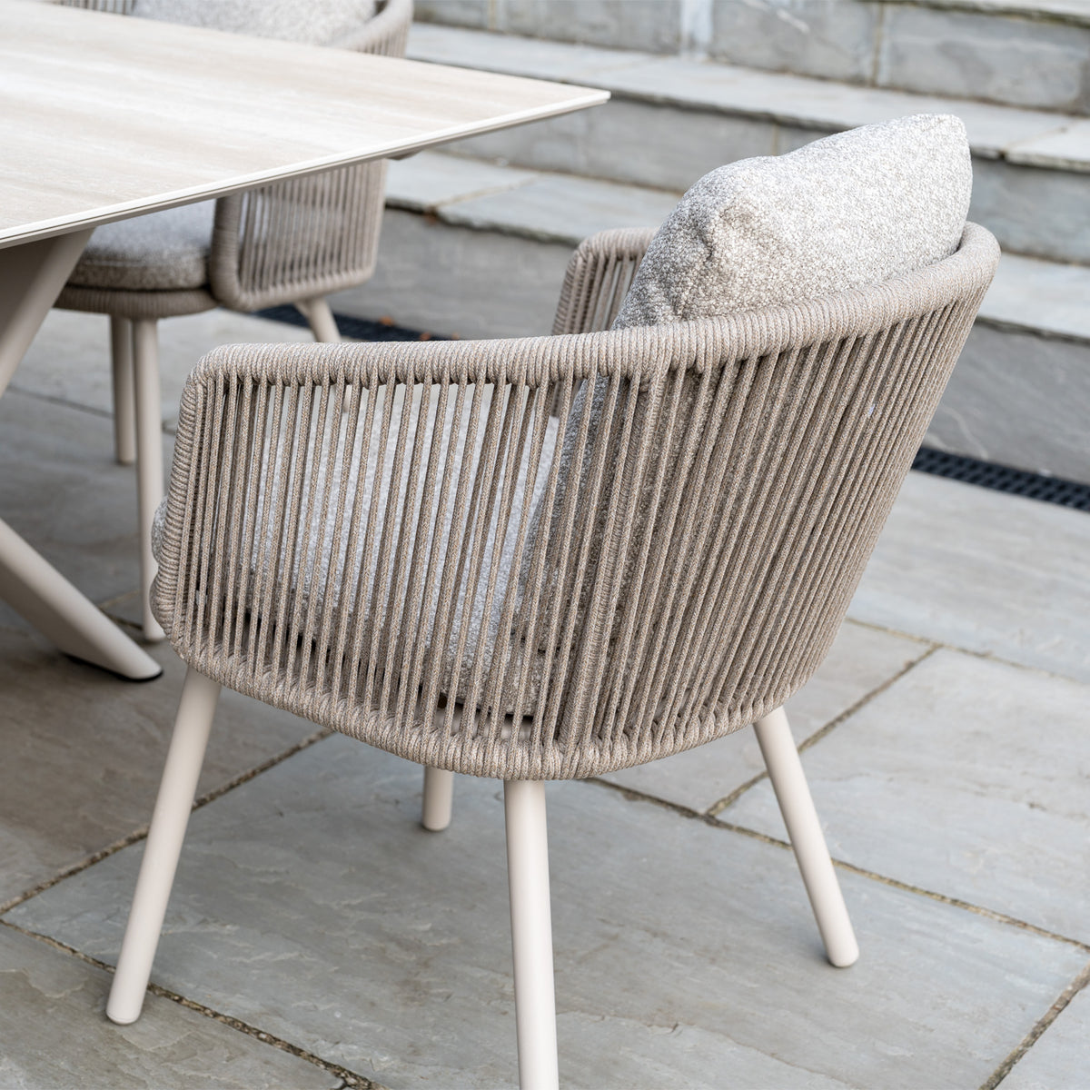 Crafted from sturdy aluminium ensures that the set is highly durable but is also protected by a premium powder coating, offering you peace of mind when it comes to your outdoor dining. The woven, olefin rope, curved backrests adds volume and depth, maintaining a relaxed yet refined aesthetic within your garden space. Its fabric also features scratch and UV-resistant properties for your ease. In addition, the chair comes with a seat pad which is designed to provide further comfort.