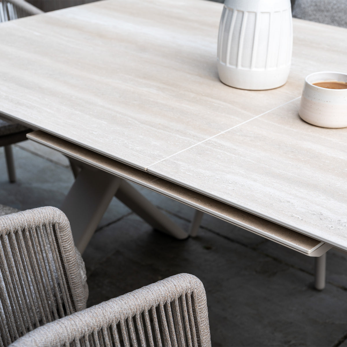 Designed with a stone top and an aluminium leg frame, the dining table features a slick sliding mechanism, meaning that expanding the dining table is as easy as a simple glide. This dining set adjusts to your space, style and gatherings with ease.