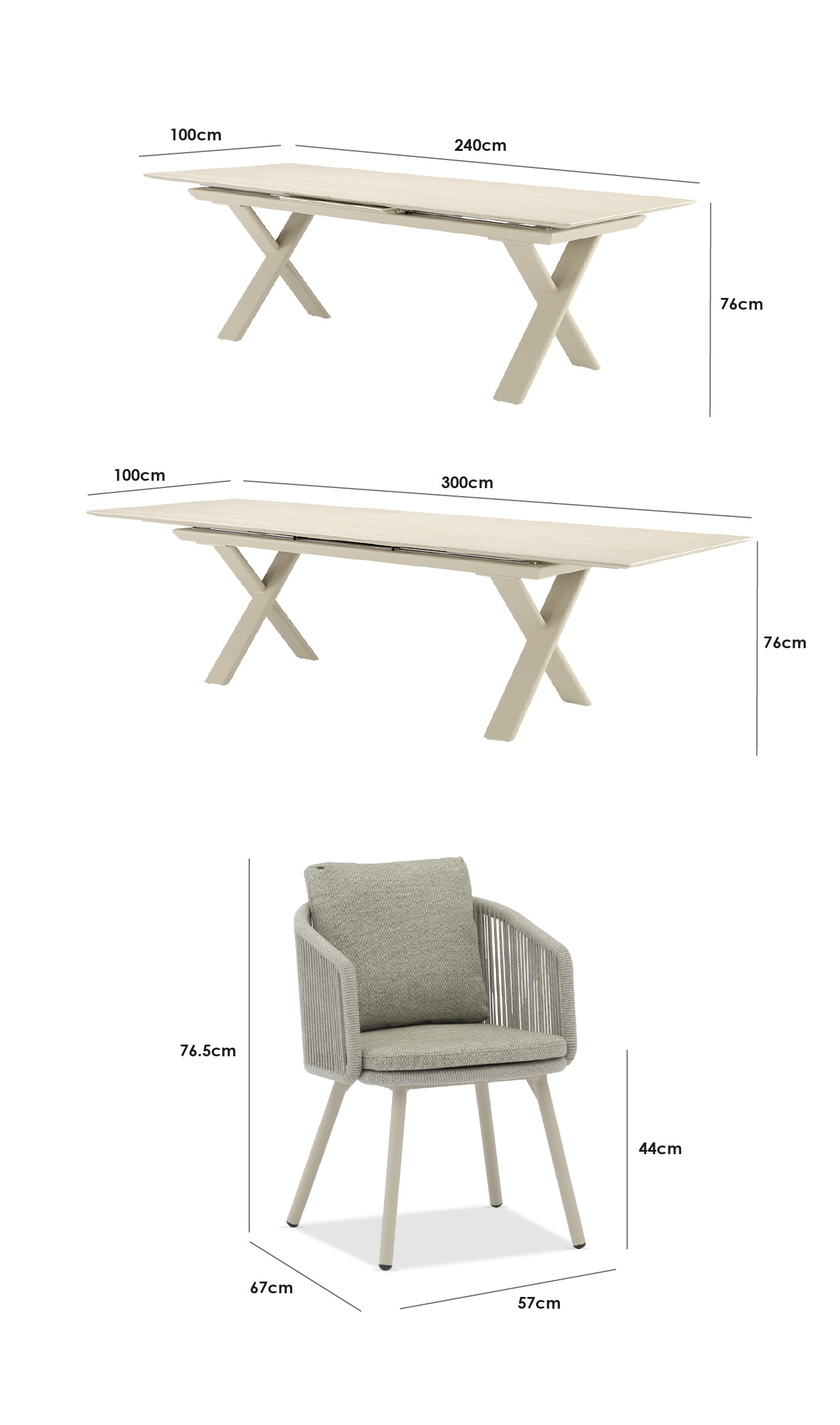 Dining Table: W240/300cm x D100cm x H76cm