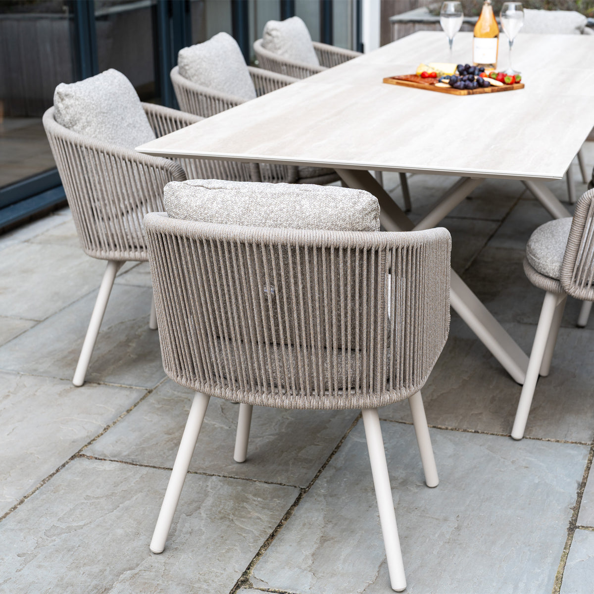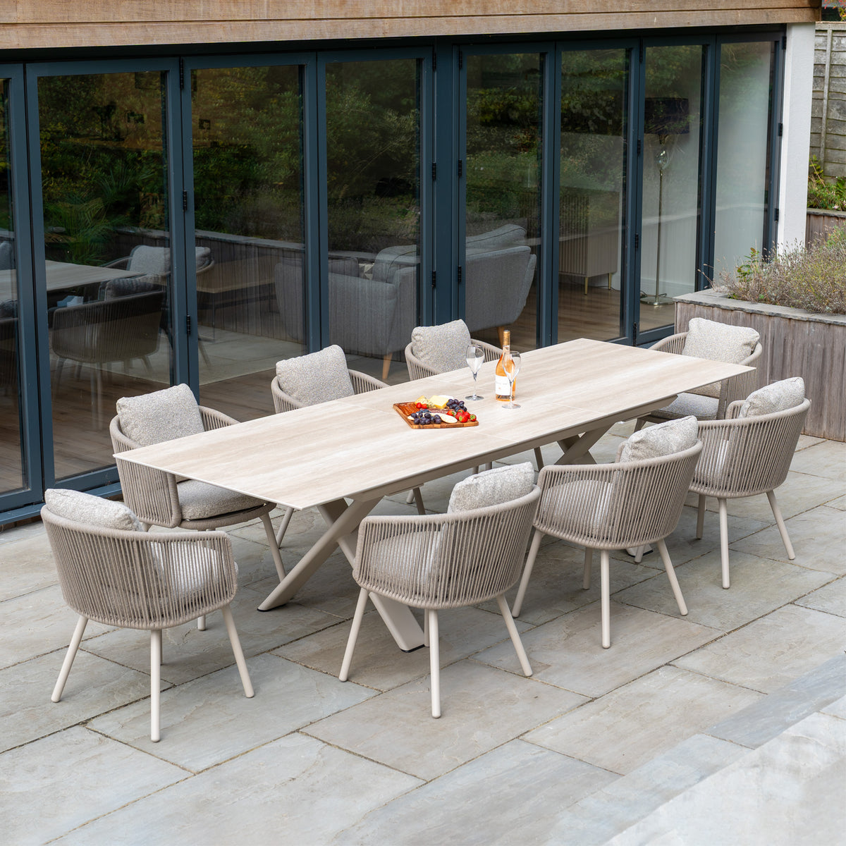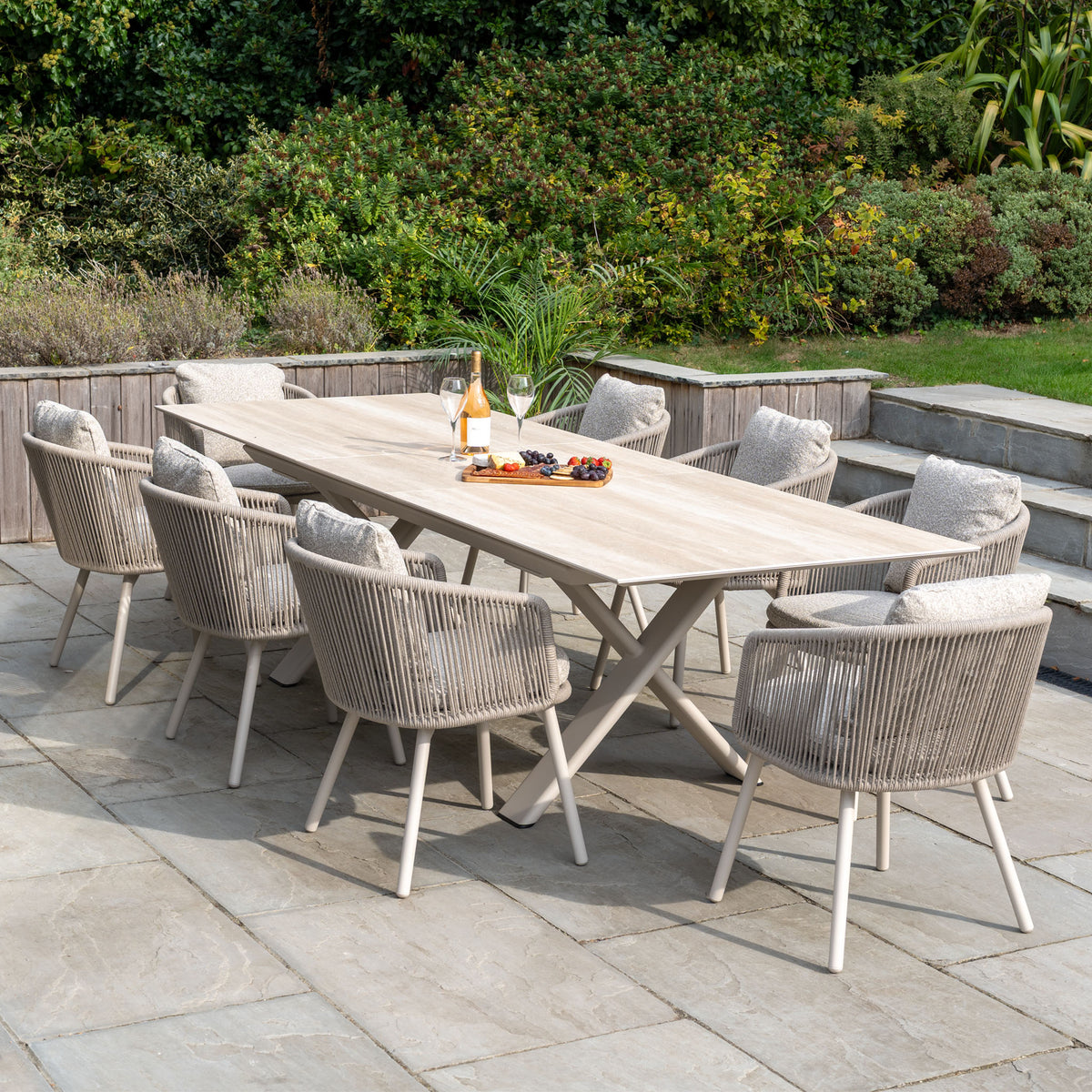 Elevate your garden space with the Theia 8 Seat Rope Dining Set with Albatross Extending Table in Oatmeal; the perfect addition for your outdoor space.